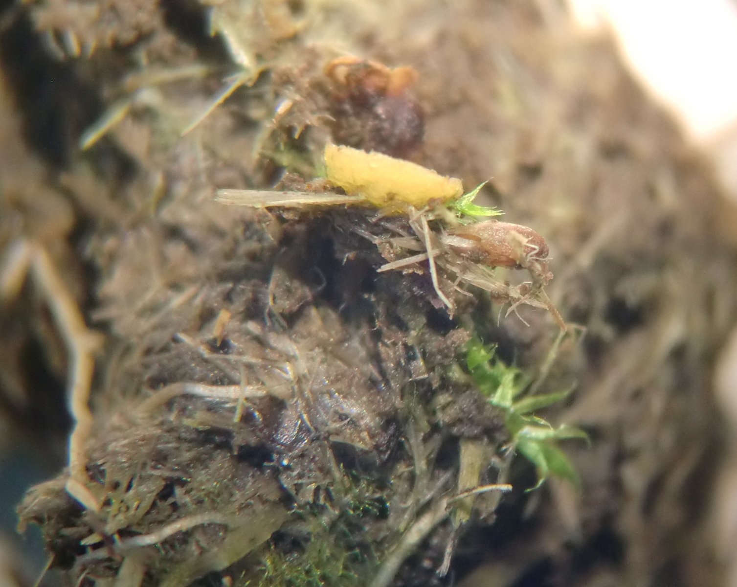 vor ein paar Tagen habe ich nochmals bei den Rinder-Fladen vorbei geschaut. Unglaublich! Die sind da jetzt schon vor ca. 3/4 Jahr (vermutlich beim Alm-Abtrieb im Okt.) fallen gelassen worden und fruktifizieren immer noch. Im Schatten von Huflattich-Blättern usw. hielt sich genug Feuchtigkeit. Neu gibt es mehrere blass ockergelbliche, sitzende Apothezien von bis zu 2,3 mm Durchmesser, die aber keine Haare haben.