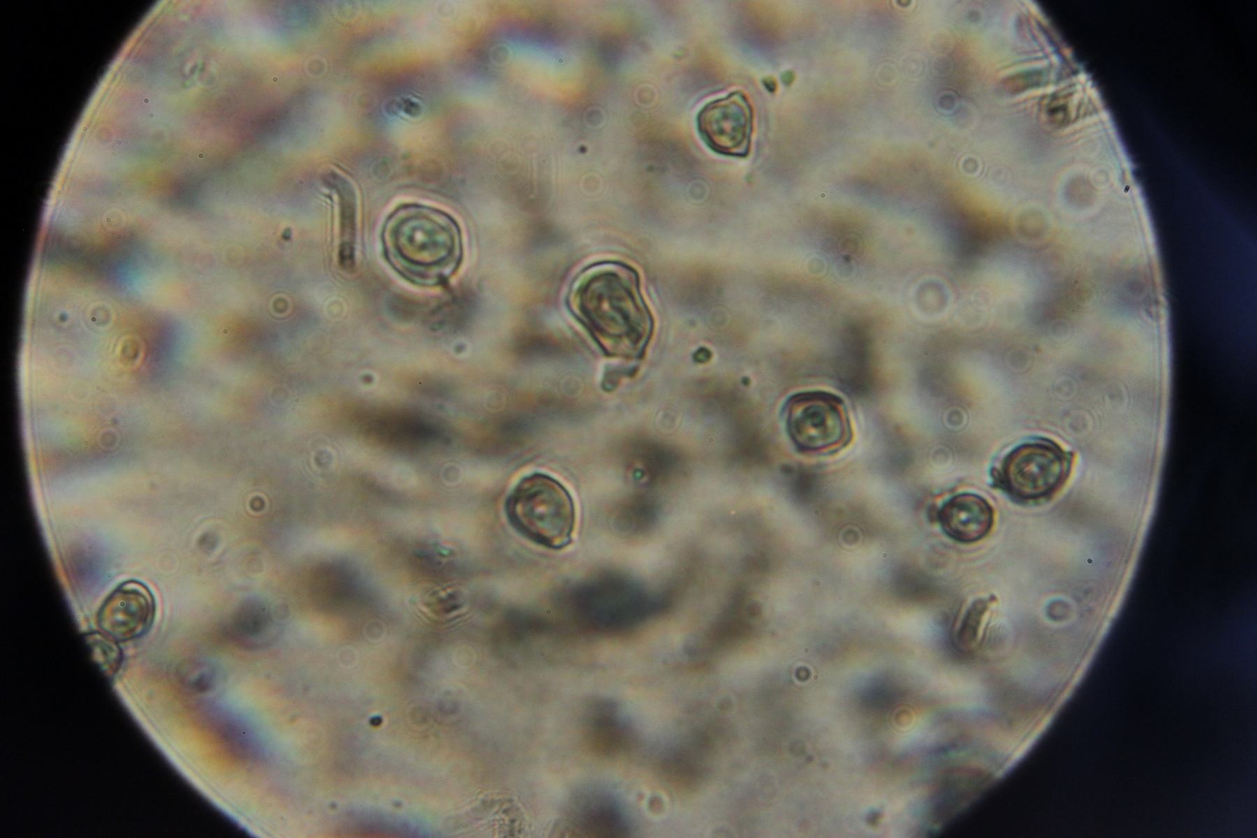 am letzten Samstag habe ich das schöne Wetter am Rhein genossen und dabei auf der Ölgangsinsel (die nebenbei bemerkt weder eine Insel ist, noch etwas mit Öl zu tun hat - hier ging man früher zum Aale fangen) jede Menge Feldmannstreu, Eryngium campestre gefunden. Der hatte auch dankenswerterweise kleine braune Flecken auf den Blättern, so daß ich mir das mal unterm dem Mikroskop genauer angeschaut habe. Und siehe da: Entyloma eryngii, der ganz nette Sporen hat, die in einer unregelmäßig geformten Hülle stecken EDIT: eine unregelmäßig dicke Wand haben: