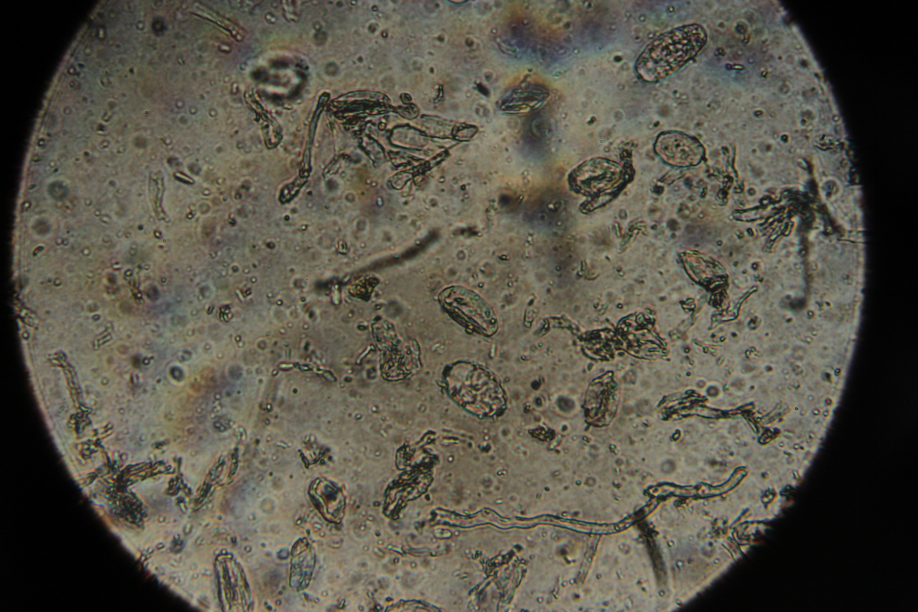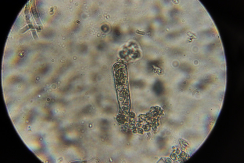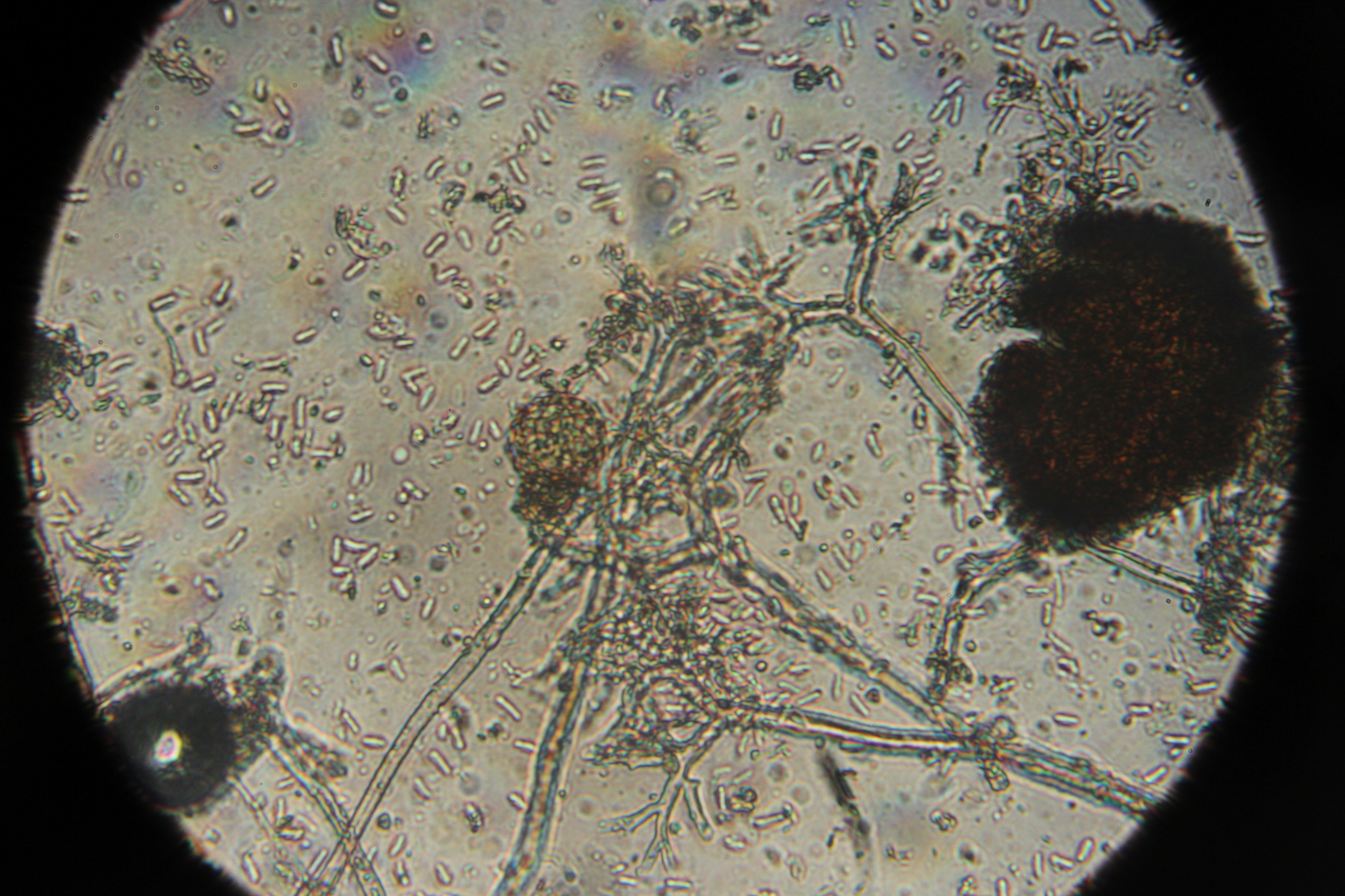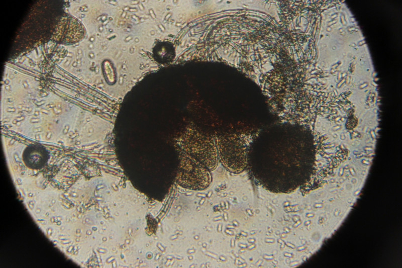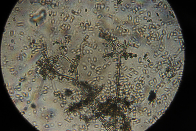 6. Makroskopisch sieht man erstmal Erysiphe euonymi auf Euonymus europaeus, beim Blick durchs Mikroskop gibt sich dann auch der Befall mit dem Hyperparasiten Ampelomyces quisqualis zu erkennen.