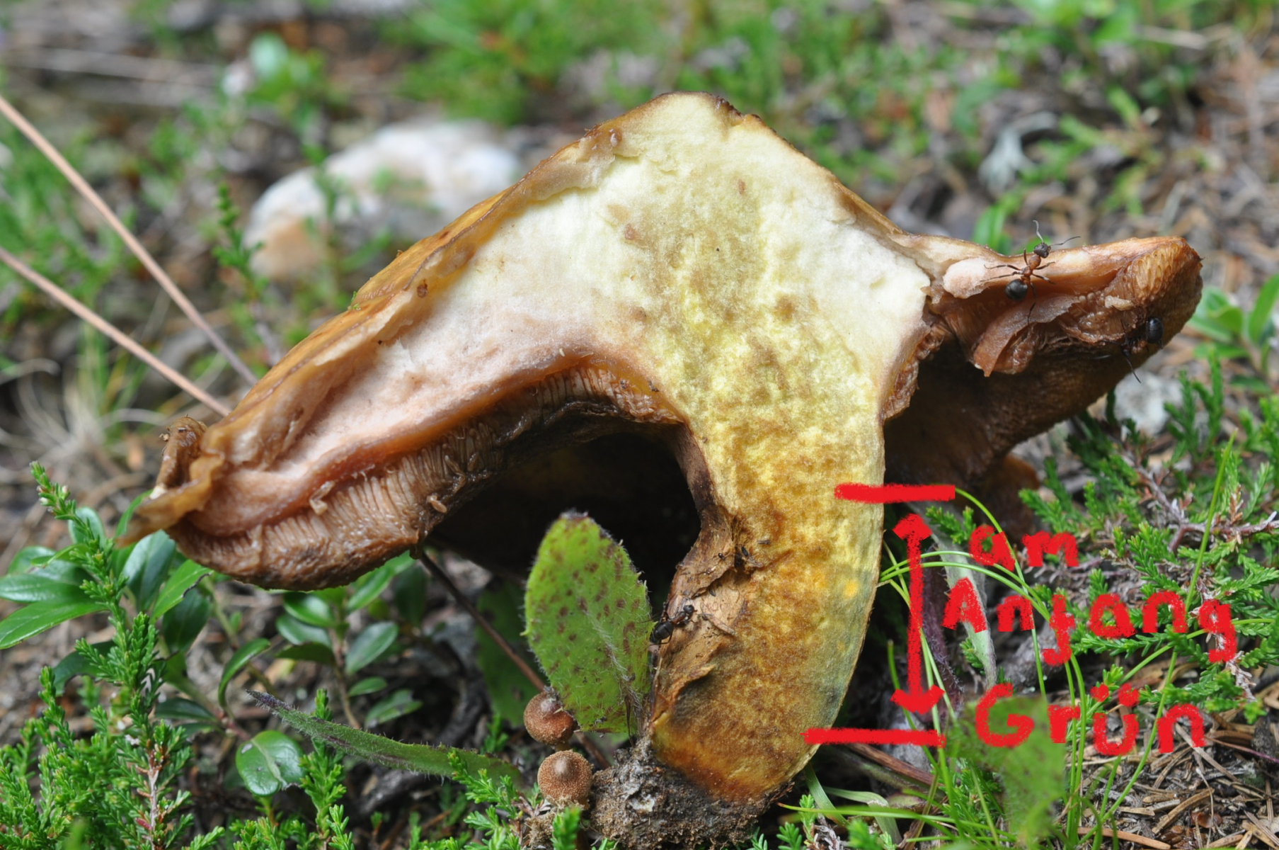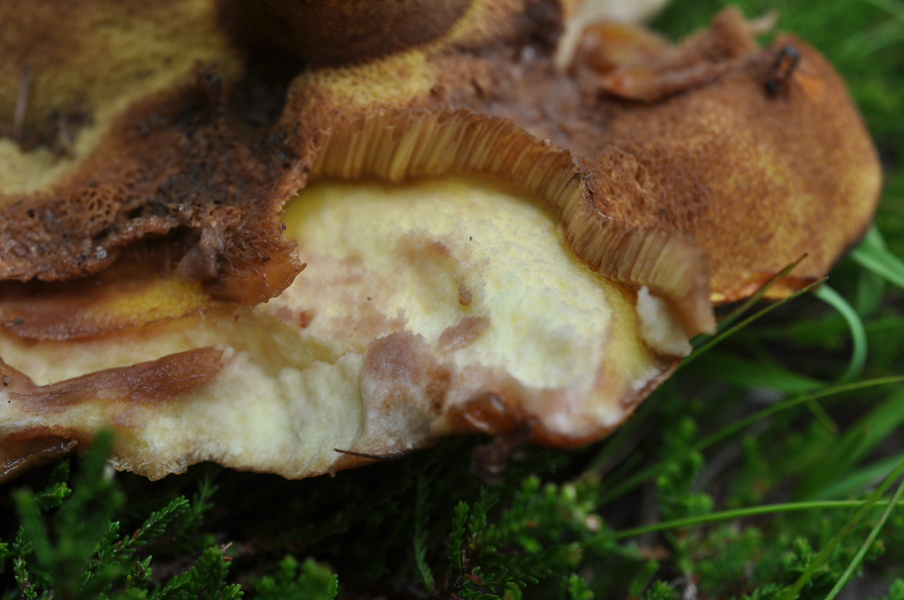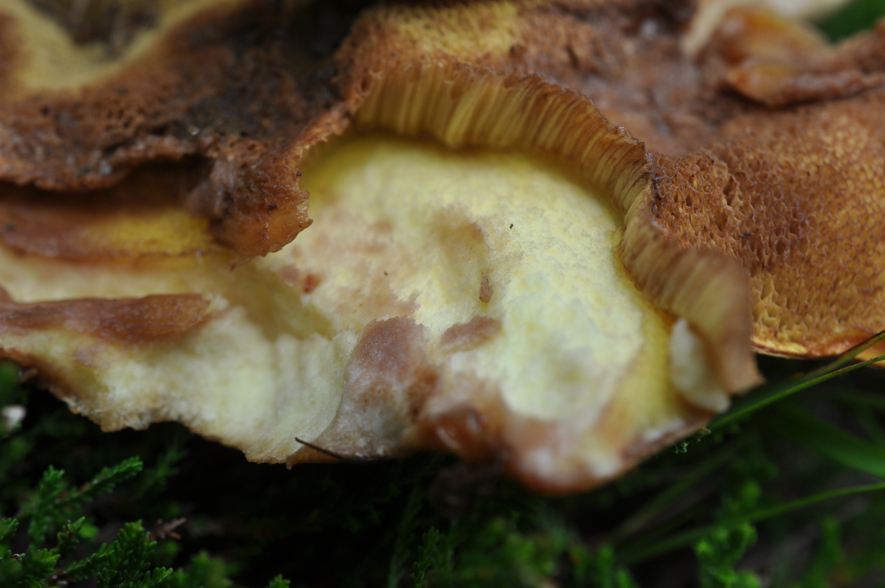 Röhrenboden Gelb . Fruchtkörper Fleisch und auch unten Huthaut Fleisch KEINE VERFÄRBUNG aber :