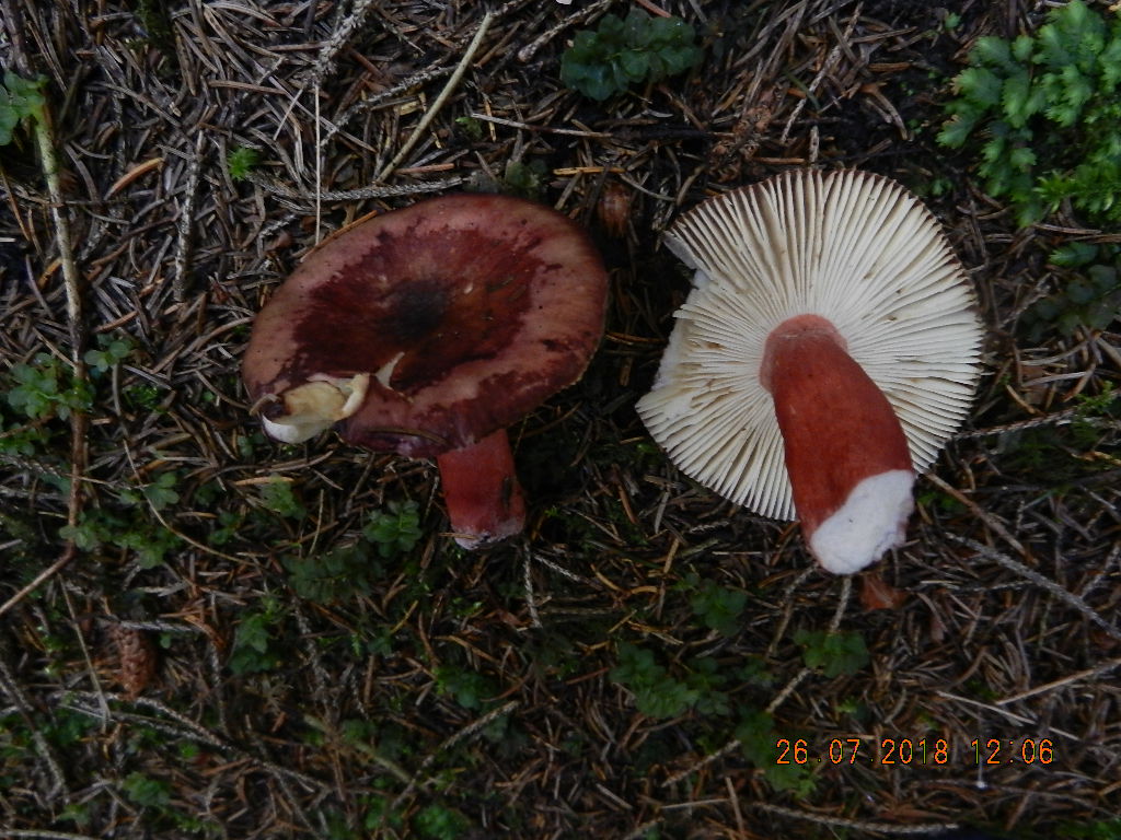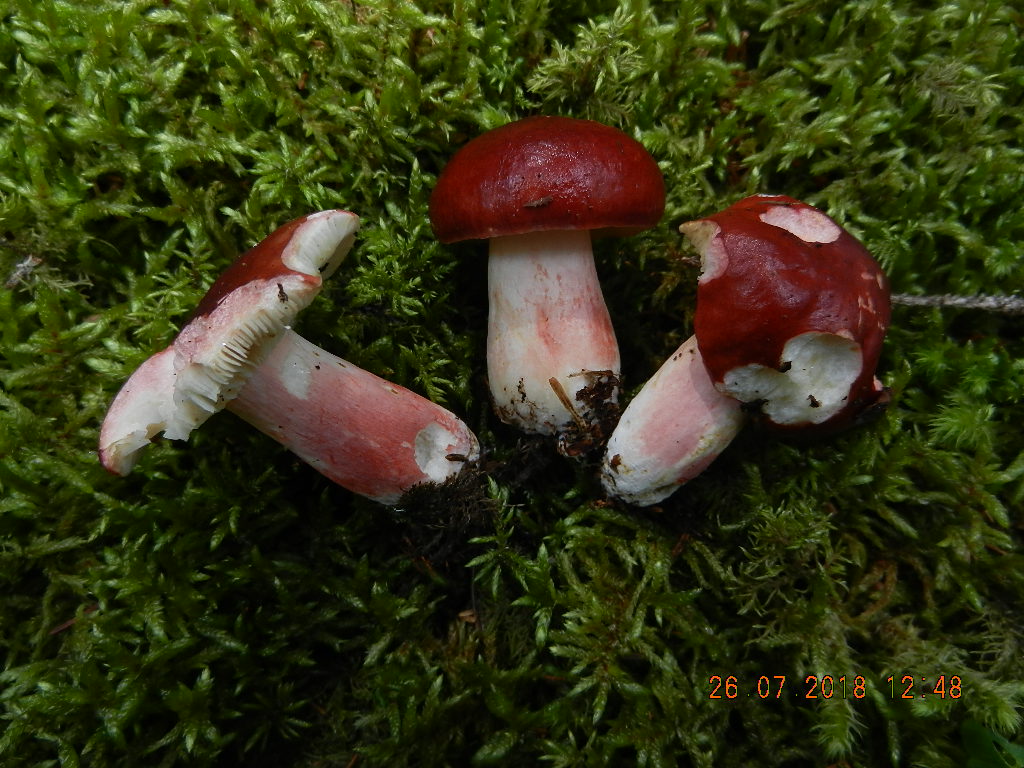 Nr. 2: Russula fuscorubroides (Dunkelroter Täubling), sensu BON/Pareys, Artstatus unklar, Genanalysen zufolge eventuell nur eine Form von R. queletii (Stachelbeertäubling), mit einheitlich rotgefärbtem Stiel bis hin zur Stielspitze, nur sehr mäßig scharf