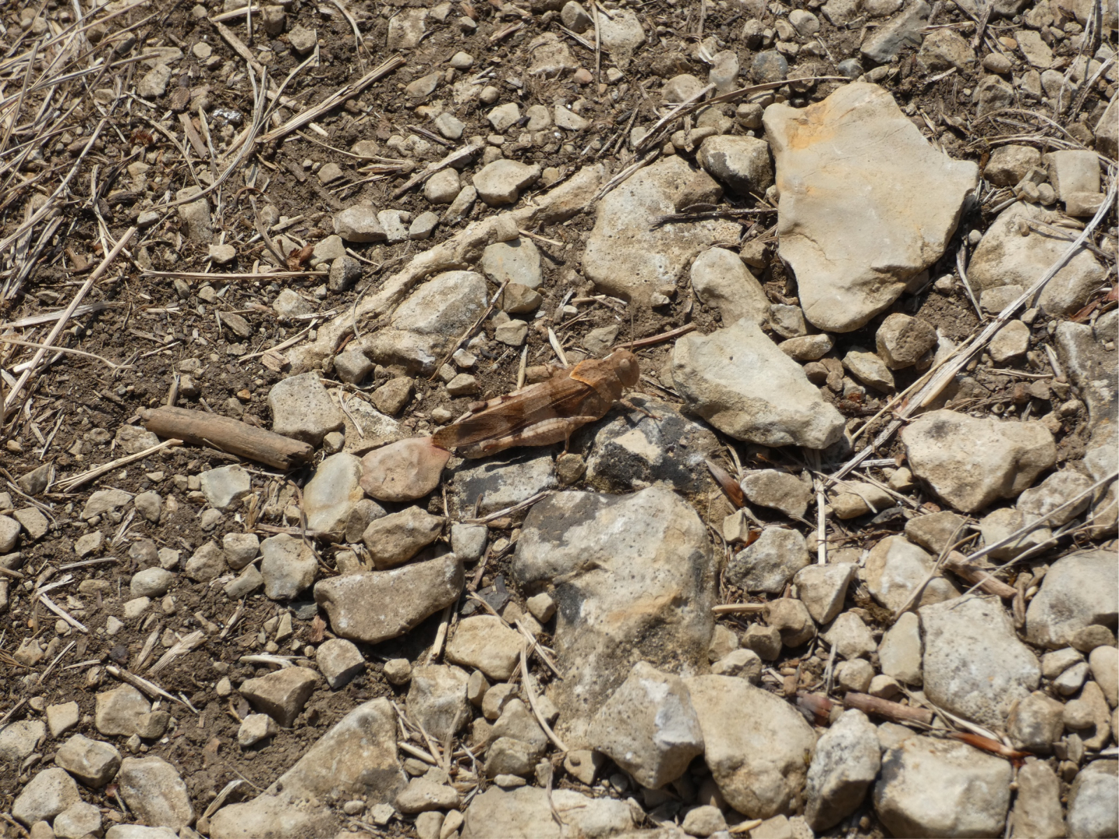 Blauflügelige Ödlandschrecke. Leider kriegt man die nie im Flug aufs Foto! Trotz akrobatischer Hüpftänze ist uns das nicht gelungen. Ihre Flügel sind mindestens so blau wie die eines Bläulings, aber in einer etwas anderen Blautönung.