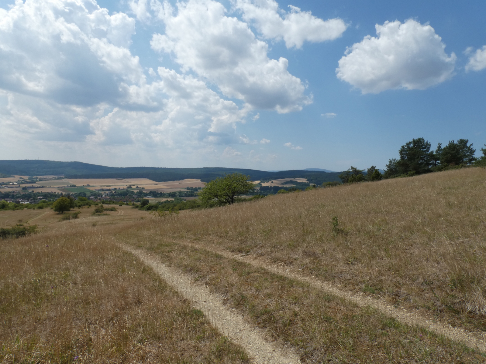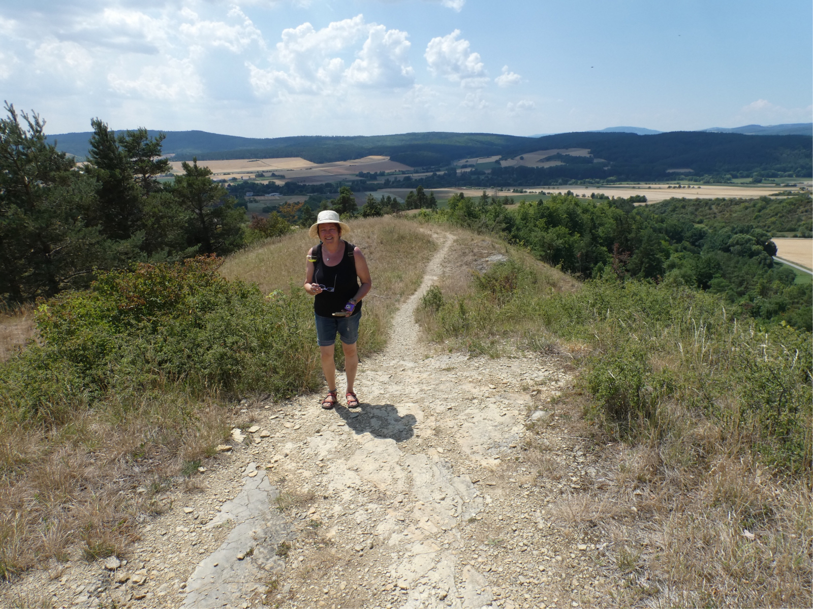 Das sind hauptsächlich Landschaftsfotos, damit ihr euch ein Bild vom Habitat der schönen Falter machen könnt - und von der (in der Hitze gebratenen) Grüni. Die Geräuschkulisse der vielen Schrecken, Grillen und Heimchen und die Rufe des segelnden Bussards kann ich leider nicht übermitteln...das müßt ihr euch vorstellen!