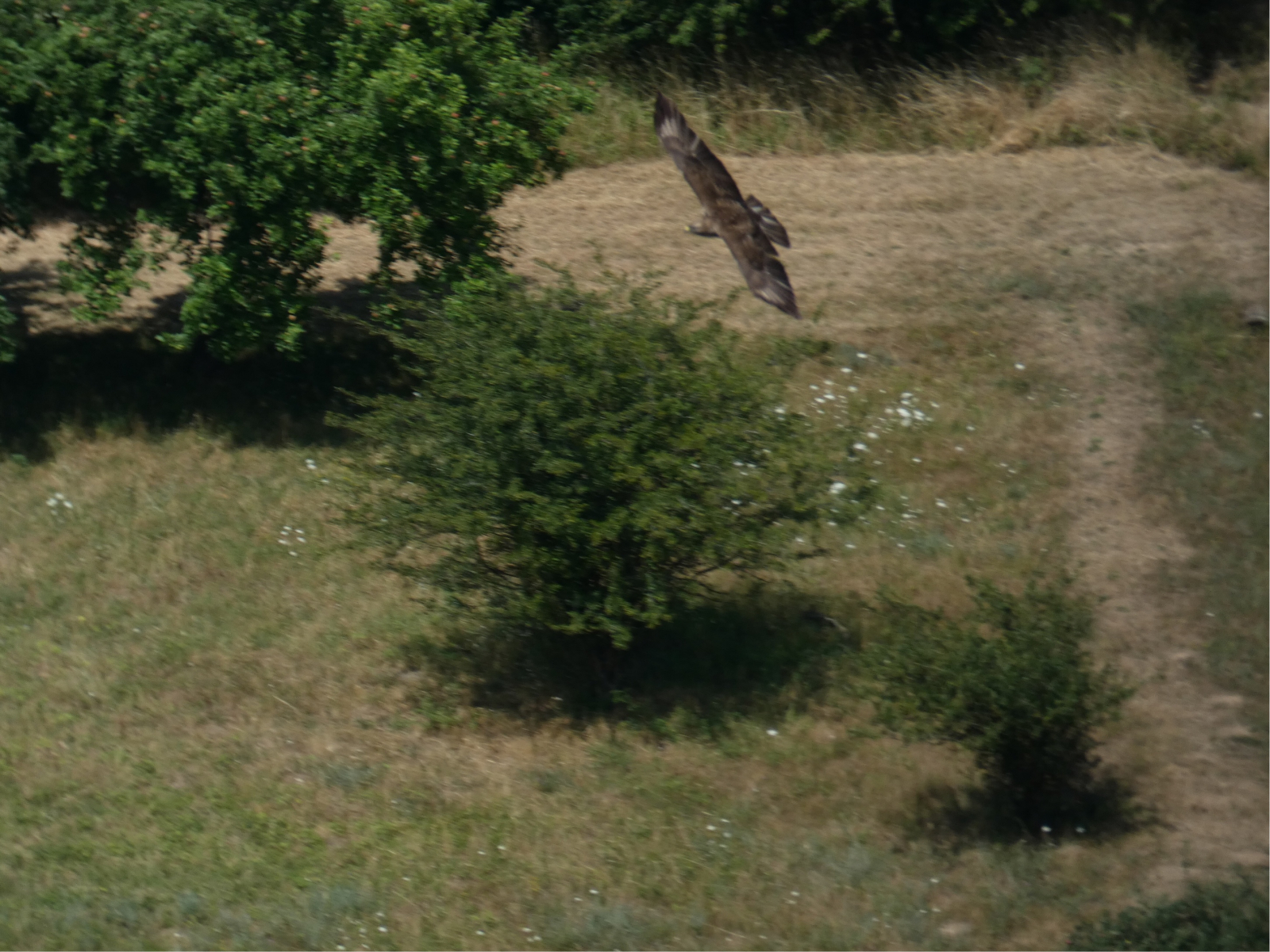 Bussard im Flug von oben gesehen! Trotz schlechter Qualität (Zoom bis zum Gehtnichtmehr) mußte ich das zeigen. Der Vogel schraubte sich im Hangaufwind innerhalb weniger Minuten vom Tal bis weit weit über uns...