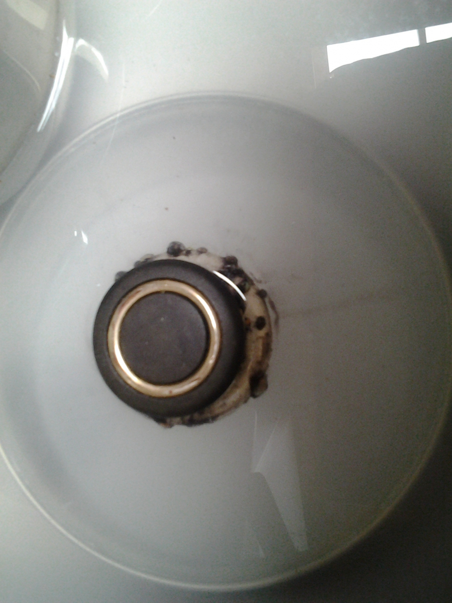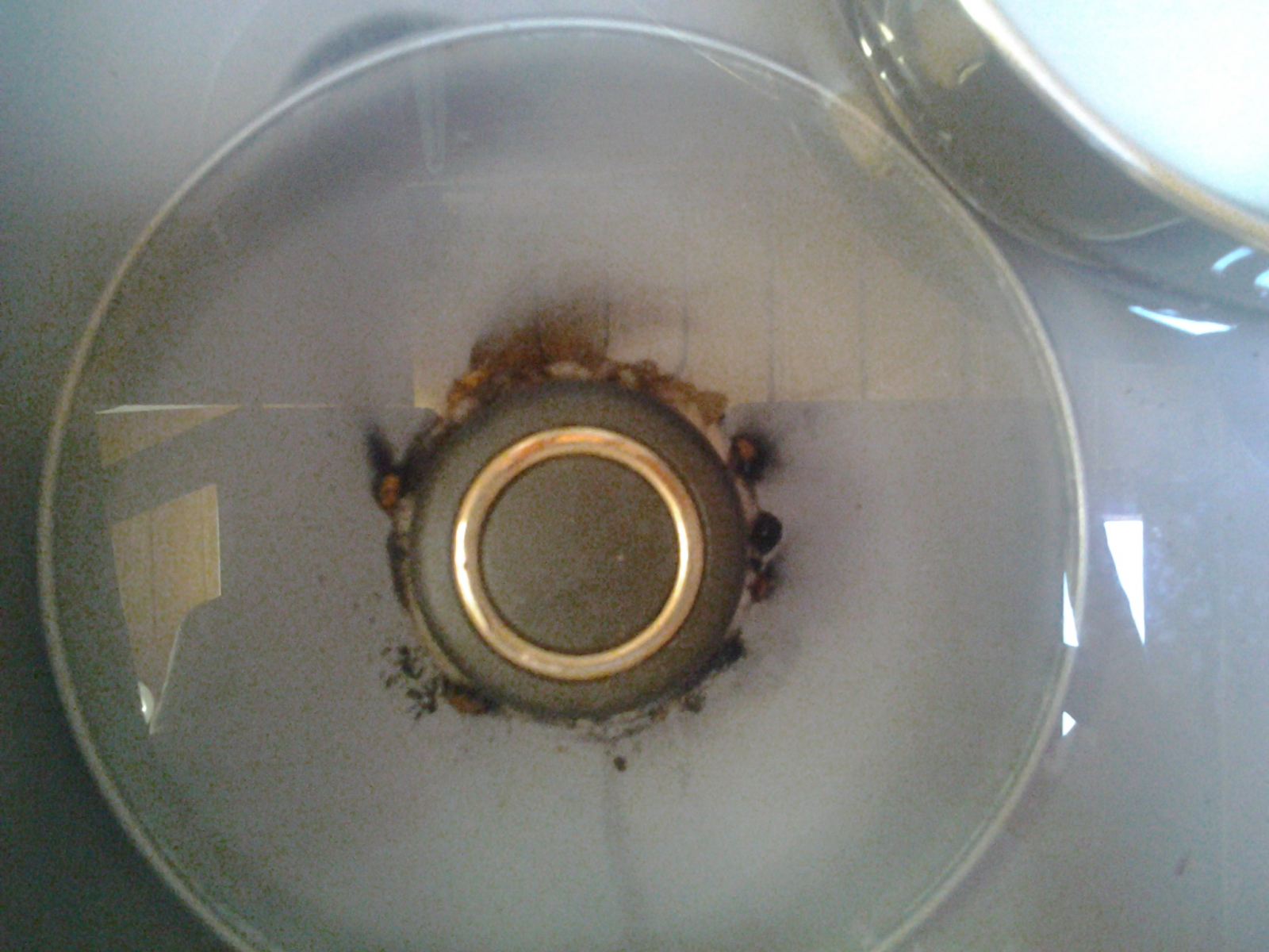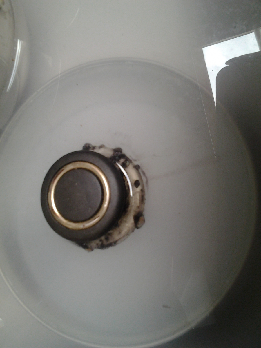 Als ich nach 1-2 Wochen wieder gekommen bin, war natürlich ein Gestank und ich habe den Topf im Badezimmer sauber gemacht und dort einen Tag in Essig einwirken lassen, gewischt, gespült, mit Desinfektionsmittel besprüht und dann nochmal ins Waschbecken in der Küche in Chlor gesetzt, damit die Rillen ordentlich "einweichen" können. Als ich 30 Minuten später den Topf angesehen habe, war ein schwarzer Sud aus dem Deckelknopf geflossen (ich meinte Sporen) und es haben sich kleine braune Flecken an dem Metal vom Knauf gebildet (dachte jetzt bildet sich da etwa ein Pilz?). Nun denn, eine weitere halbe Stunde später habe ich nochmal geschaut und siehe da, es haben sich kleine "Erhebungen" aus den Flecken gebildet, wovon ich schätze, dass könnte der Fruchtkörper sein (falls es jetzt nicht doch was ganz anderes ist als ein Pilz, z.B. Kleber der sich gelöst hat und i-was anderes hat chemisch auf das Chlor reagiert). Soweit ich weiß, mögen Pilze ja basisches? Ich wollte den Topf nochmal in Essig einwirken lassen (Pilze mögen keine Säure?).