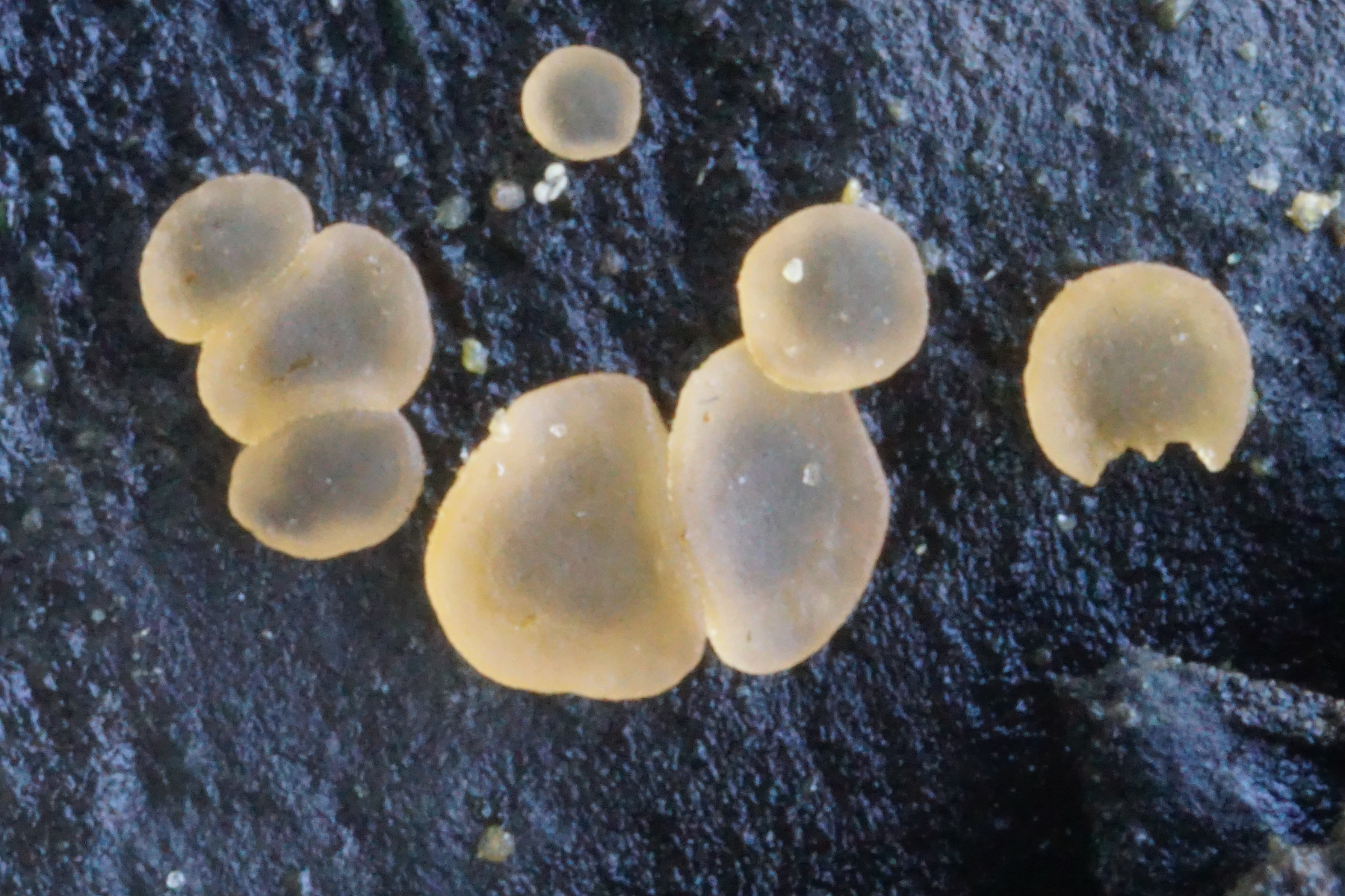 Blaß hellgelb-rosa,transparente, Fruchtkörper von 1mm Durchmesser ohne Stiel, unbehaart, auf Fichtenzapfen am fließenden Wasser