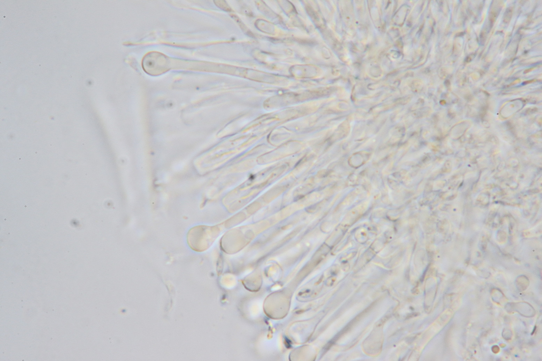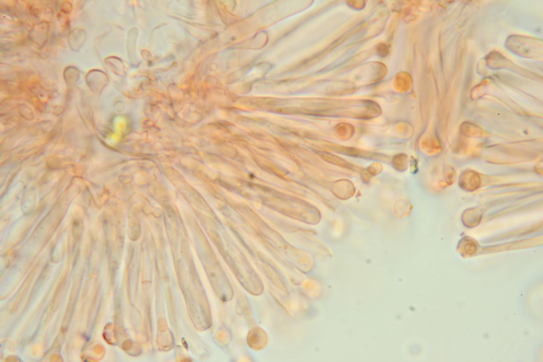Paraphysen mehrfach septiert, apikal deutlich zu einer Kugel erweitert (ca 3,5µm), teils mit krustigen Auflagerungen