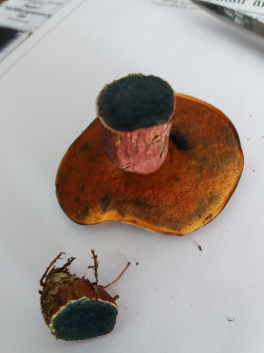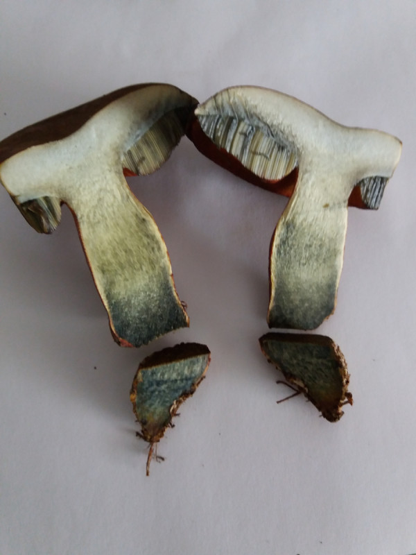 Stiel: ca. 18mm, rötliches längsverlaufendes Netz, sofort stark bläuend bis schwarz bei Anschnitt, wir dann graugrün mit der Zeit.