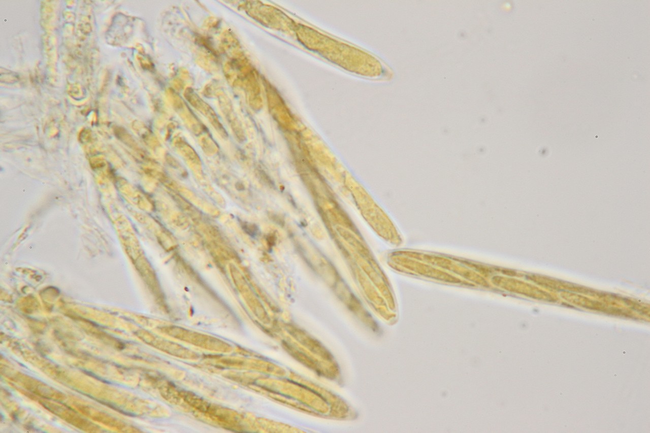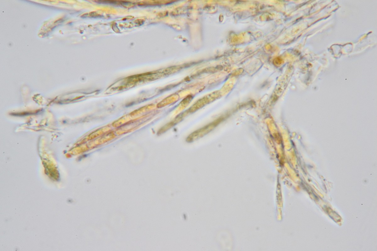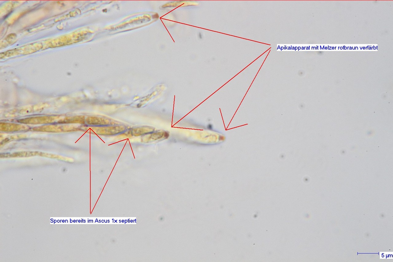 Sporen spindelförmig, glatt, hyalin, z.T. schon in den Asci 1x septiert, z.T. schwach dextrinoide Reaktion; die Braunfärbung kann aber auch