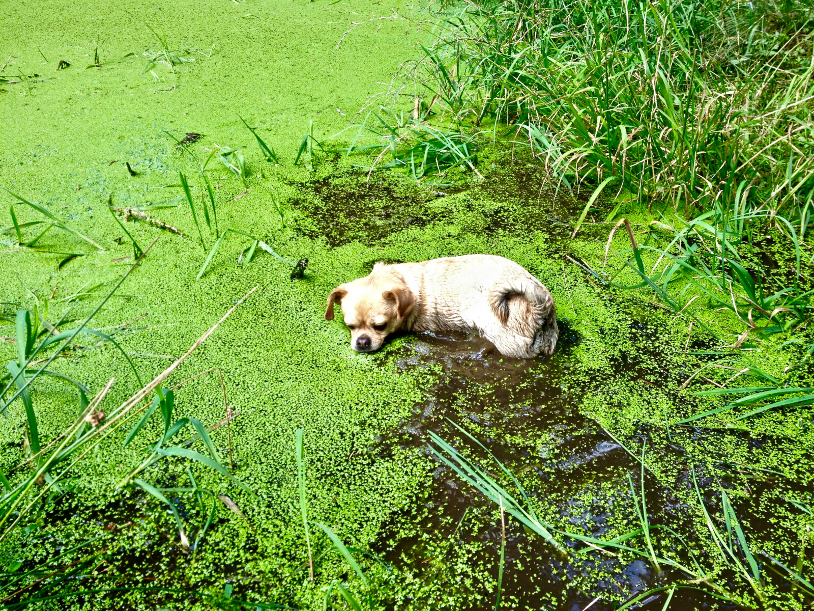 Außerdem haben wir nach den umgesetzten Bergmolchen geschaut. Leider war nichts zu sehen. Die Teichlinsen hatten sich in einer geometrischen Reihe vermehrt. Immerhin: Wasser war noch darunter. Hier das Beweisfoto mit morastigen kleinen Pilzspürhund. Der hat so gestunken, dass ihn sogar die Zecken verschmäht haben.