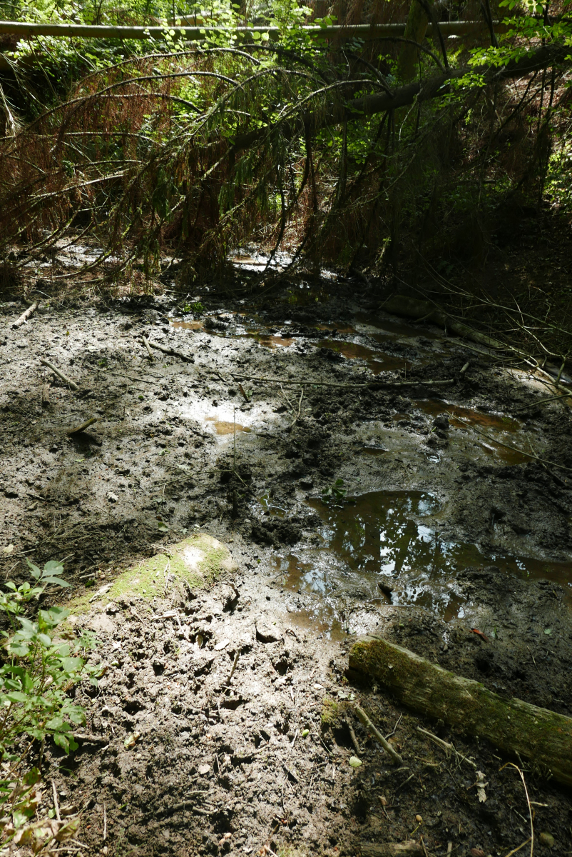 Ausgesucht hatte ich eine etwas feuchtere Klamm, in der sonst immer ein Bach fließt. Tatsächlich führte er noch ein Rinnsal Wasser, und wenn man genau hinhörte, plätscherte es auch ein wenig.