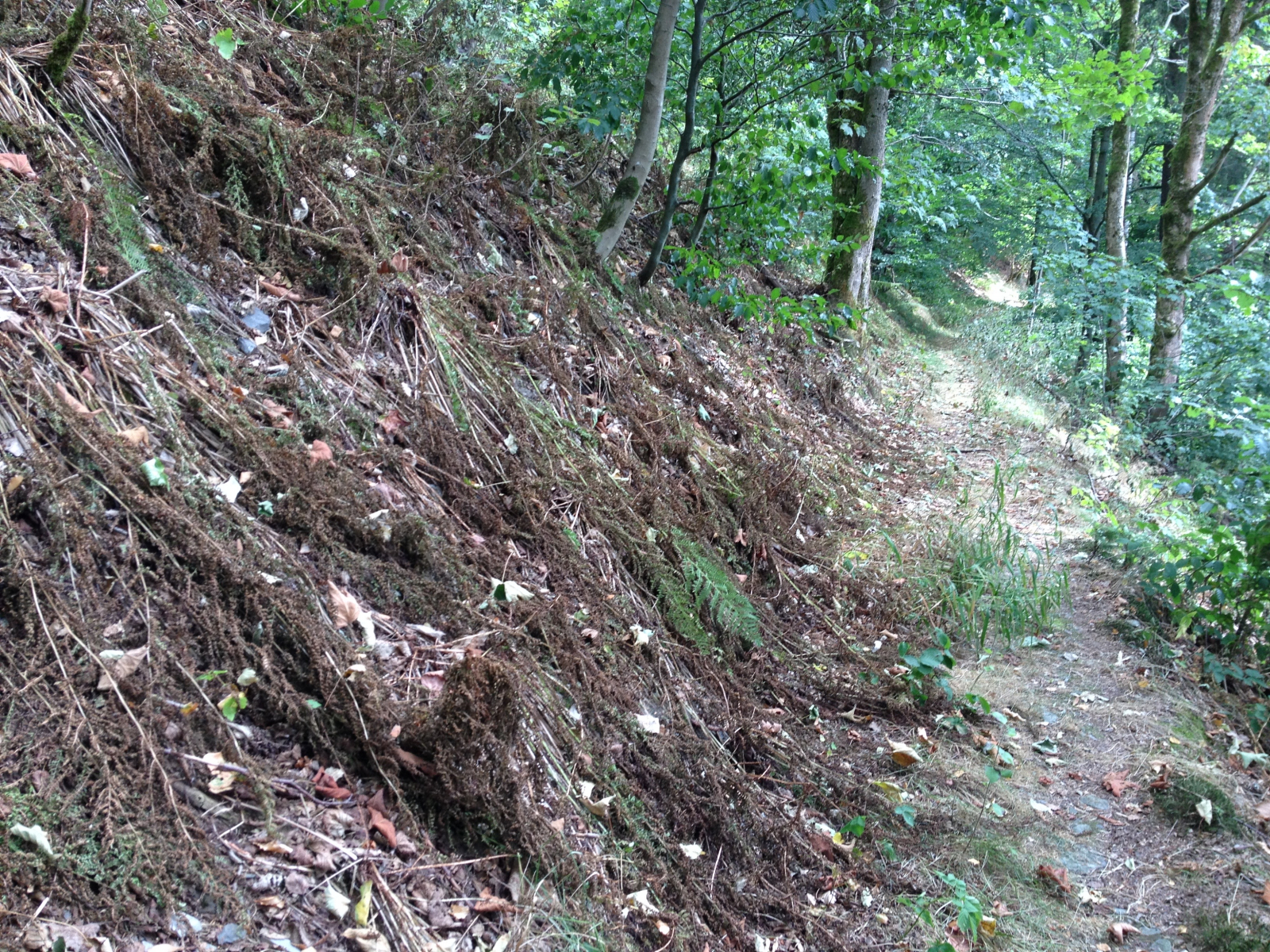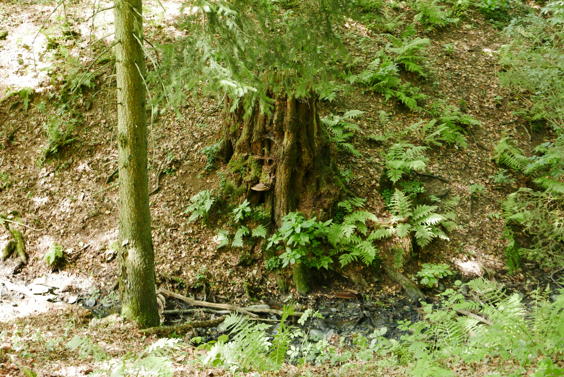 Der Weg neben dem Bach war allerdings von einigen bei den letzten Frühjahrsstürmen gefallenen Bäumen versperrt. Der Blicke wurde frei auf eine Rodung aus den letzten Jahren. Kein Wunder, dass die anderen Bäume dann so viel Angriffsfläche für den starken Wind boten...