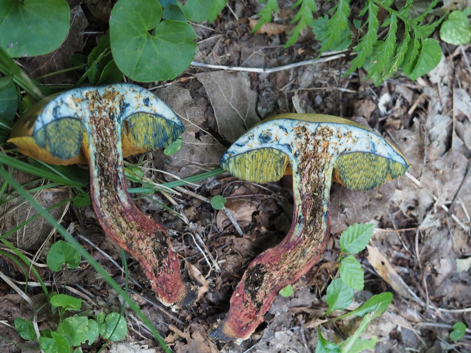 Aus meienr Sicht passt dieser Fund sogar hervorragend zu Suillellus mendax (Kurznetziger Hexenröhrling): Einschließlich schlaankem Habitus, eher undeutlich ausgeprägtem Netz in obererm Stielteil und dafür umso deutlicher ausgeprägter dunkelroter Beflockung im unteren Stielteil. Die Huthaut hat auch zumindest einen Hauch von rot drin, wirkt ansonsten ziemlich olivgelb, und passt ebenfalls recht gut in die Variationsbreite vom Kurznetzigen.LG, Pablo.