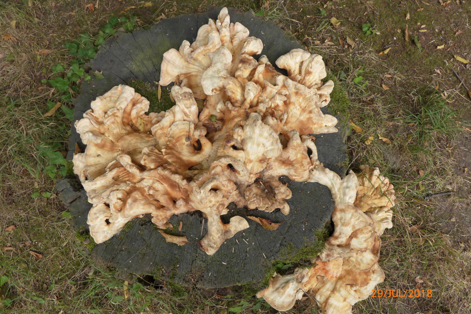 niergendwo was zu finden ! Und doch in einem Eichenwäldchen, ich bin bald vom Rad gefallen: ein Schwefelporling auf einem Eichenstamm. Durchmesser 65 cm und das bei 32 Grad.