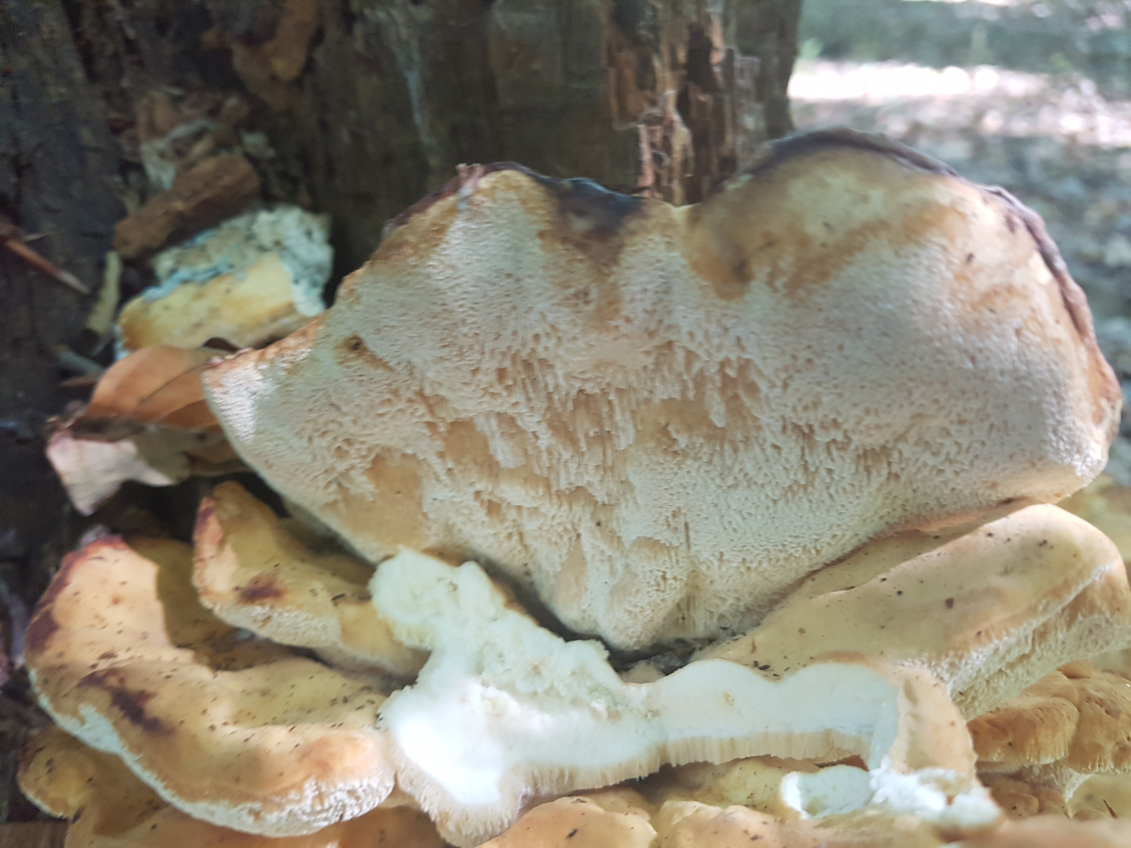 Immerhin beim Substrat kann man gut erkennen, daß es Nadelholz ist, was ein weiterer Pluspunkt für die vorgeschlagene Bondarzewia mesenterica wäre.Lg, Pablo.