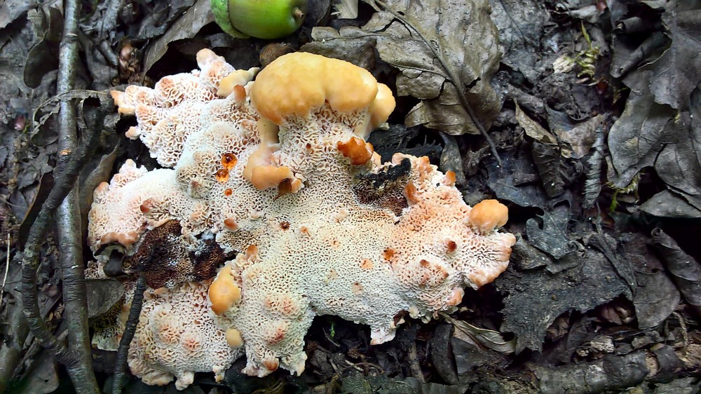 ich zeige euch hier einen Fund von heute eines Korkstachelings, der sich von mir nicht richtig einordnen lassen will. Ich halte den Pilz für den Rotbraunen Korkstacheling (Hydnellum ferrugineum), weil seim Geruch angenehm ist und sein Geschmack nicht scharf. Ansonsten käme der Scharfe Korkstacheling in Betracht (Hydnellum peckii). Irritierend ist der Standort. Überall lese ich, er kommt im Nadelwald vor, auf Nadelstreu. In diesem Fall nicht. Die Bilder zeigen Laub, haupsächlich Buche und Eiche und der Pilz wächst an einem Laubholzstubben, sicher auch Eiche. Gibt es weitere Korkstachelinge, die ein ähnliches Erscheinungsbild haben und nicht im Nadelwald wchsen?