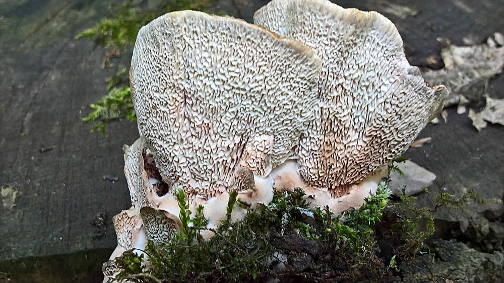 das sieht nur so aus, weil die Fruchtkörper sich tatsächlich so entwickeln als würden sie von der Unterseite nach oben wachsen. Bei den Bildern 4 und 5 sieht man die Stacheln, die aber sehr breit und teilweise labyrinthähnlich daherkommen.