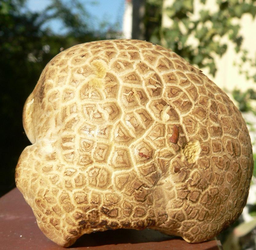 Er blaut an der Schnittfläche, riecht bissl wie Essig finde ich. Ganz "hart", massiver Pilz. Trat gebündelt auf, also haufenweise um die Bäume herum.