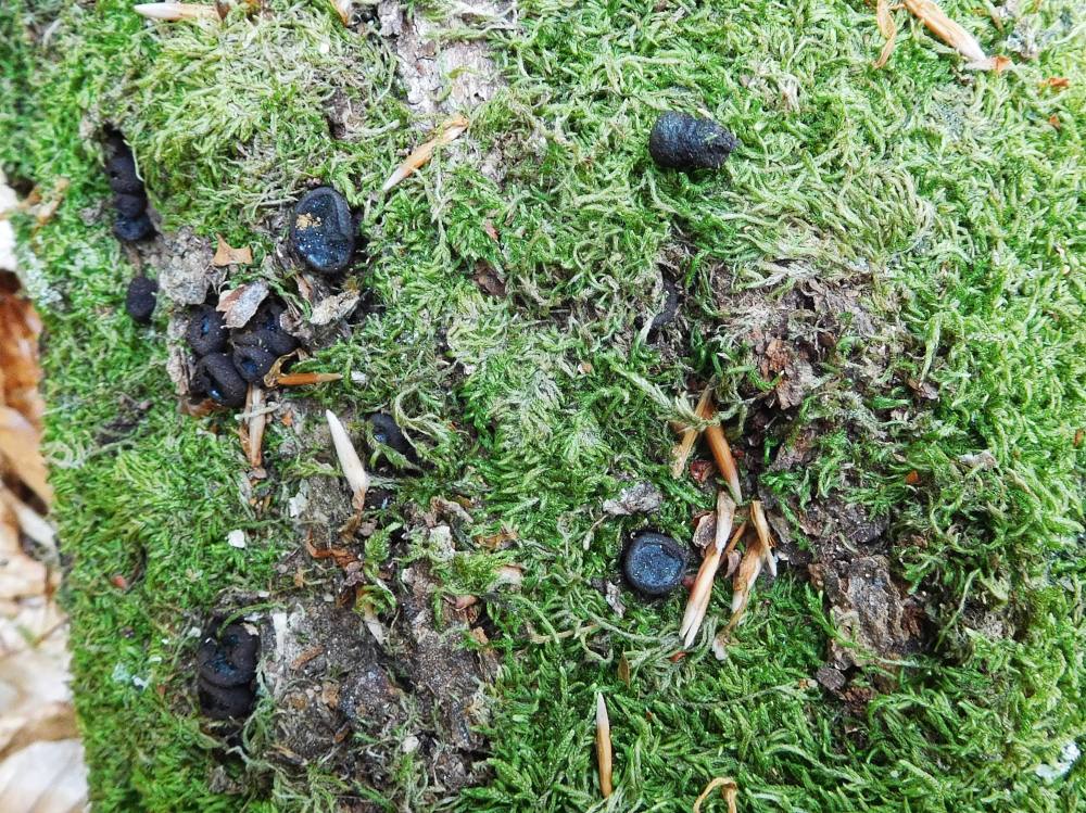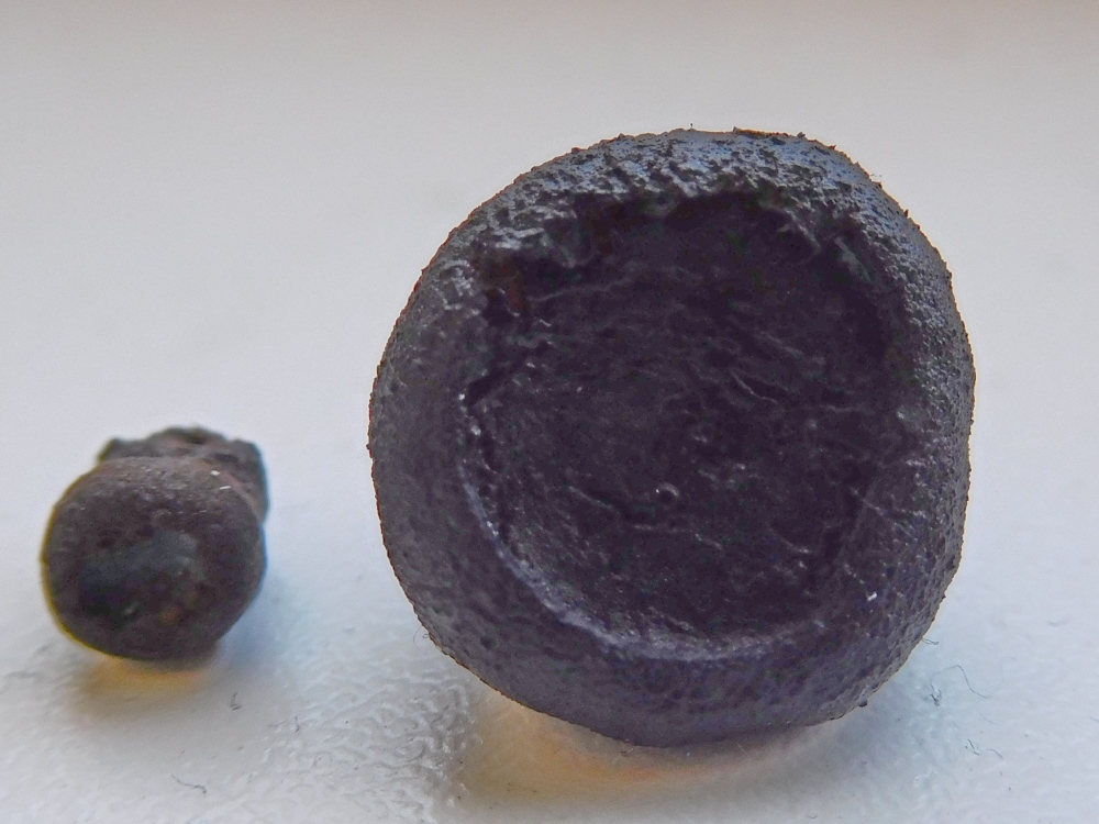 An einem liegenden Ast von dem Baum dann winzige schwarze und harte Becherchen (3 - 4 mm). Die sehen wie Schmutzbecherlinge aus. Ich habe zwei gleich große Fruchtkörper mitgenommen. Einen habe ich in`s Wasser gelegt. Das "Becherchen" wurde zum Becher!