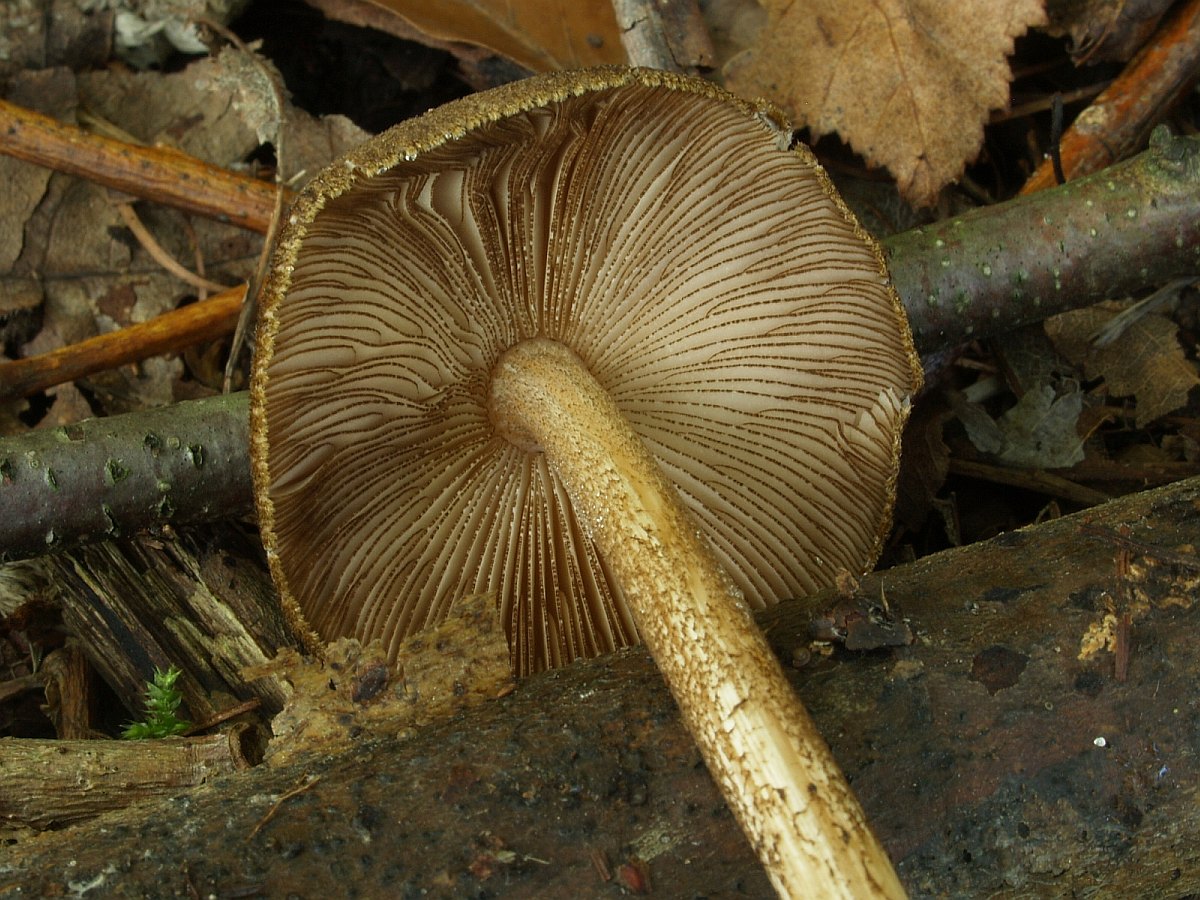 Mit vollständig braun gefärbten Lamellenschneiden kommen nur P. nigrofloccosus (=atromarginatus) und P. umbrosus in Betracht. P. umbrosus kann man m. E. komplett ausschließen, da dieser in allen Altersstadien eine körnige Huthaut hat. Der Stiel ist darüber hinaus deutlich punktiert und nicht längsfaserig. Jung ist immer eine deutlich netzadrige Struktur erkennbar, die sich auch im Alter (zumindest im Hutzentrum) nicht vollständig auflöst.