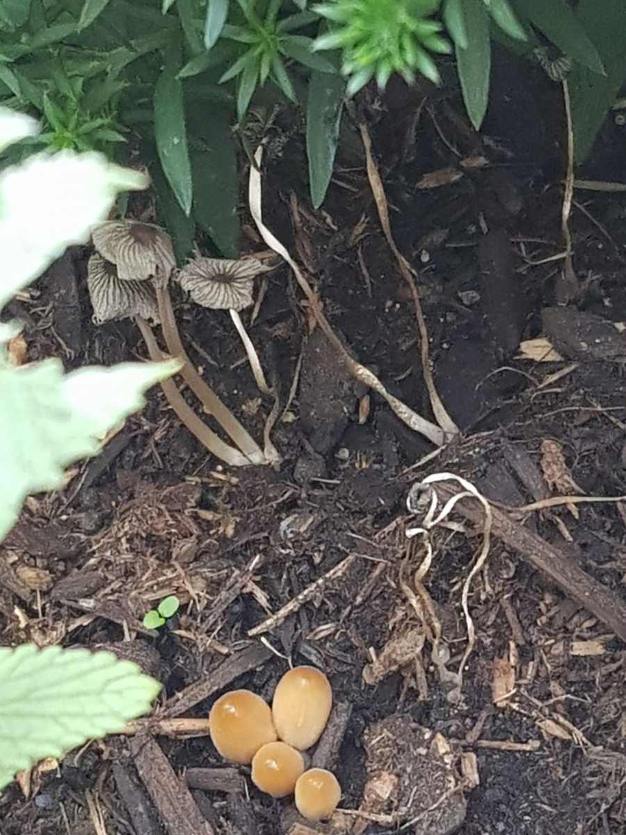 Bei meiner heutigen Besichtigung habe ich neben vielen Bienen und Hummeln auch festgestellt, dass sich auf dem Erdboden kleine bräunliche/gelbliche Pilze gebildet haben.