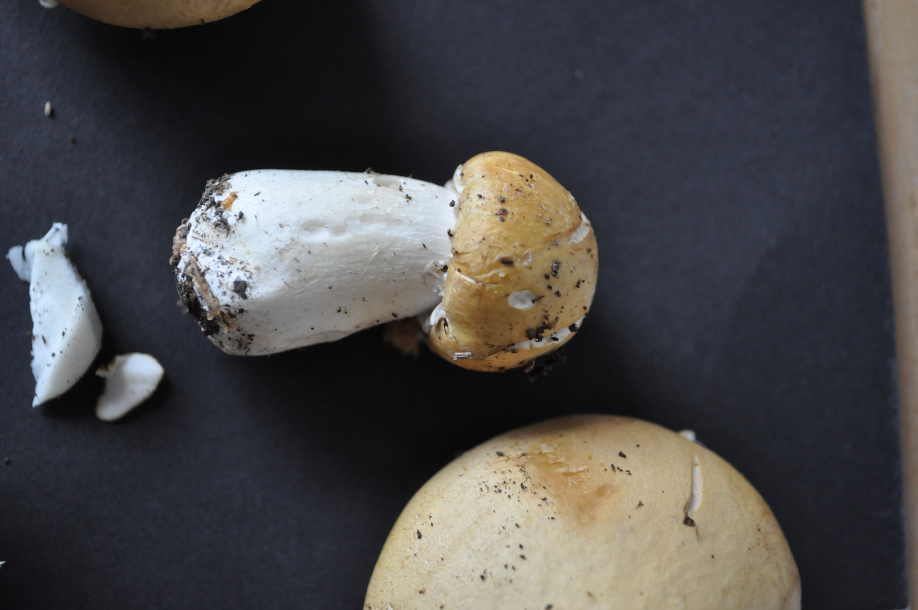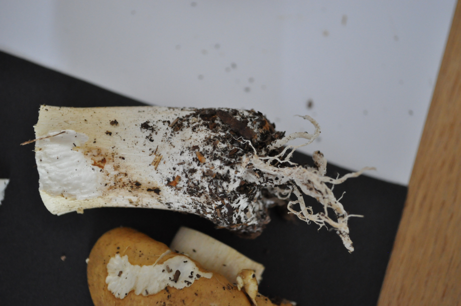Stiel: Besonders beim Trocknen auffallende Längsrillen erkennbar, Grundfarbe weiss ;gelblich "angehaucht".Konsistenz faserig.