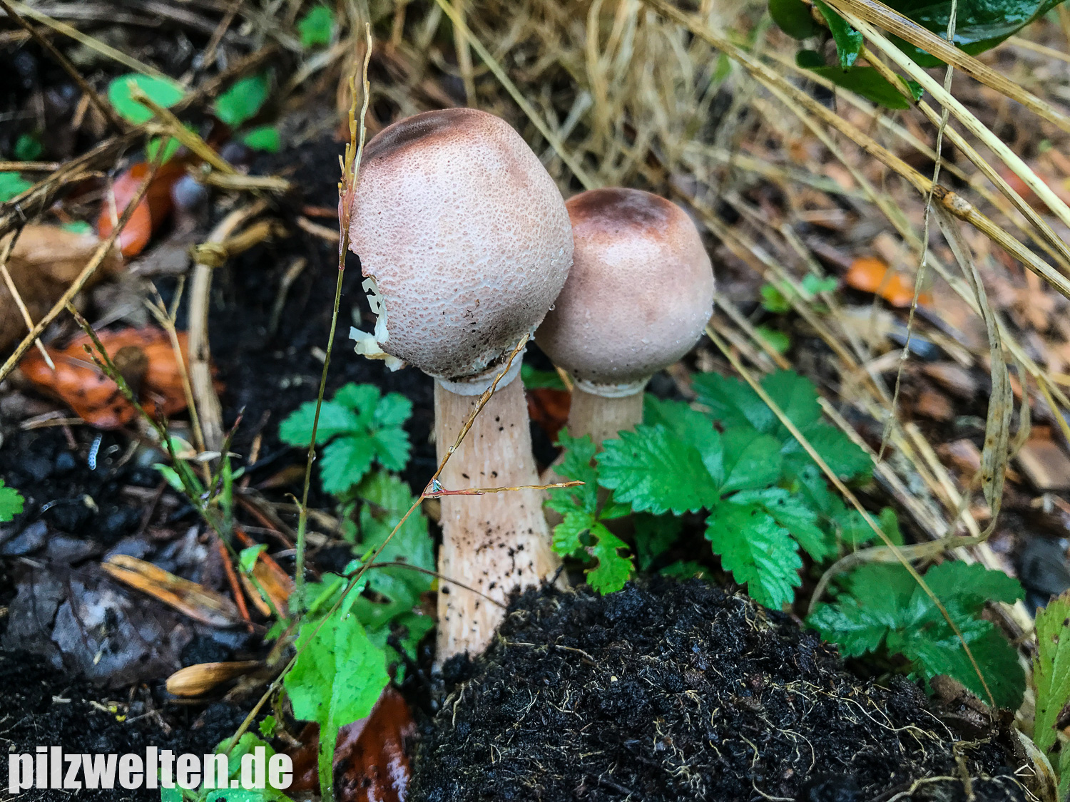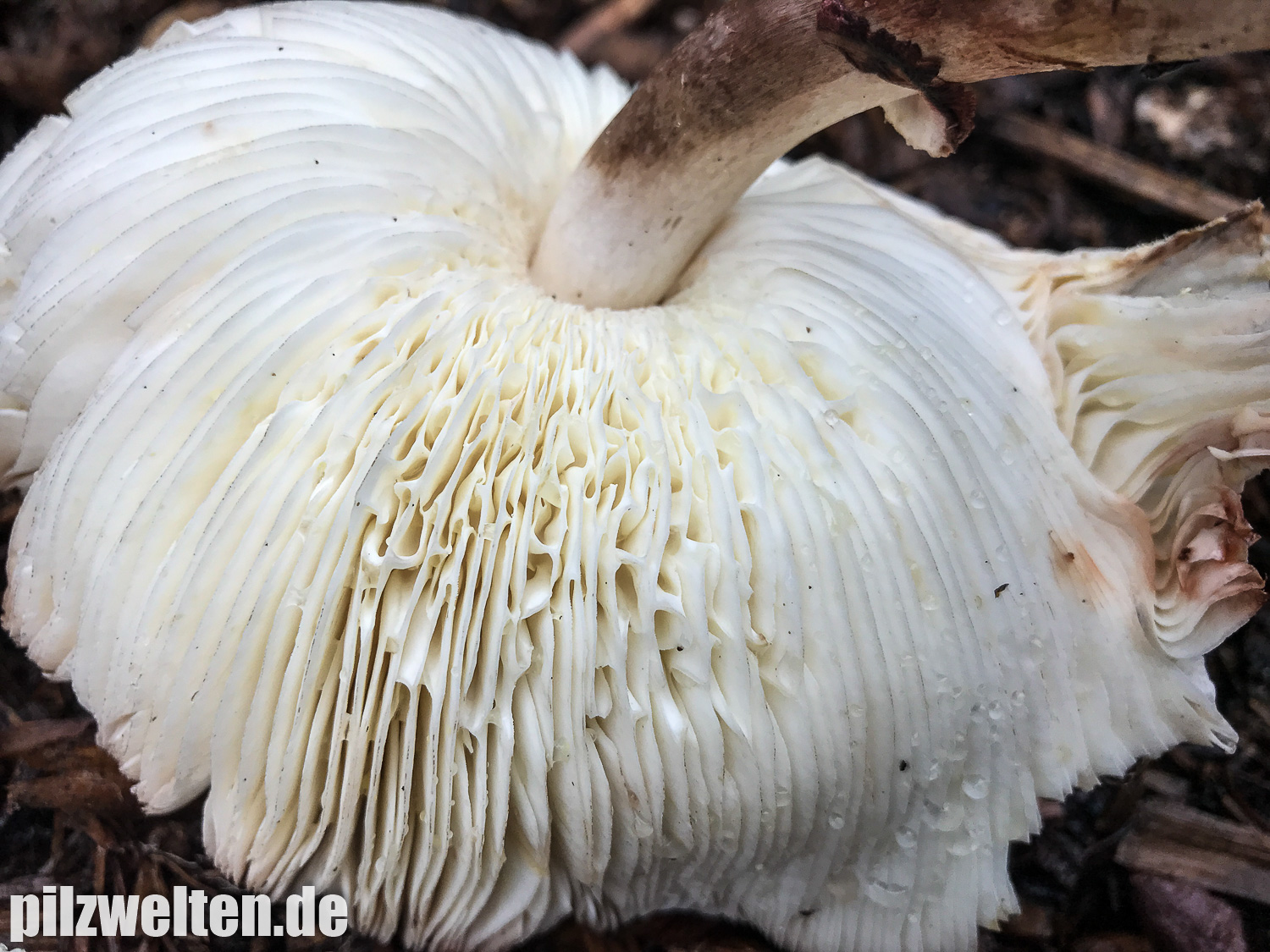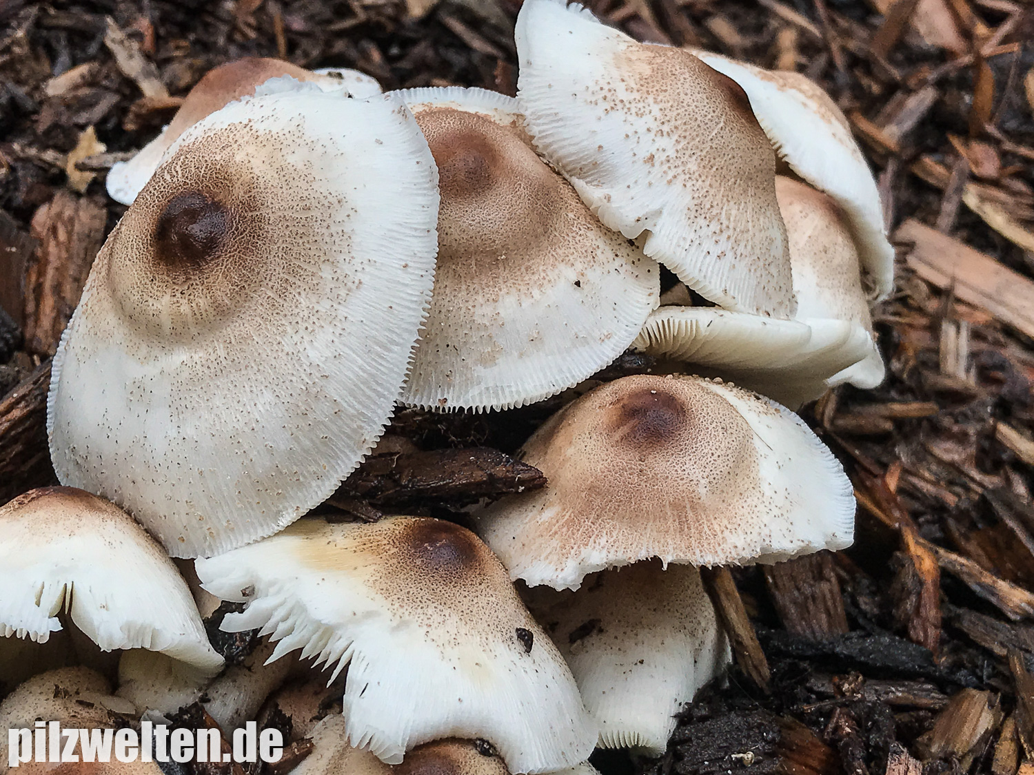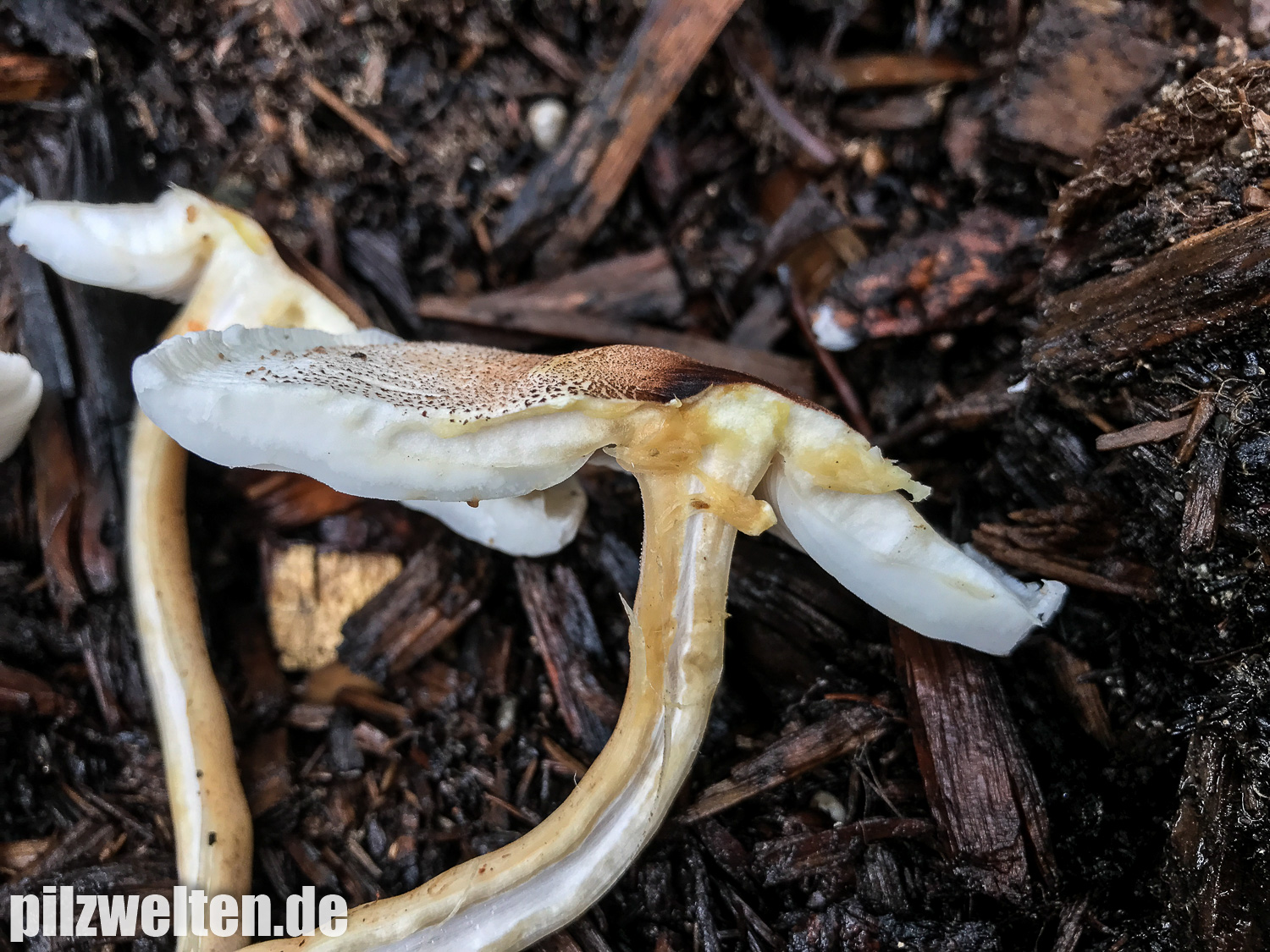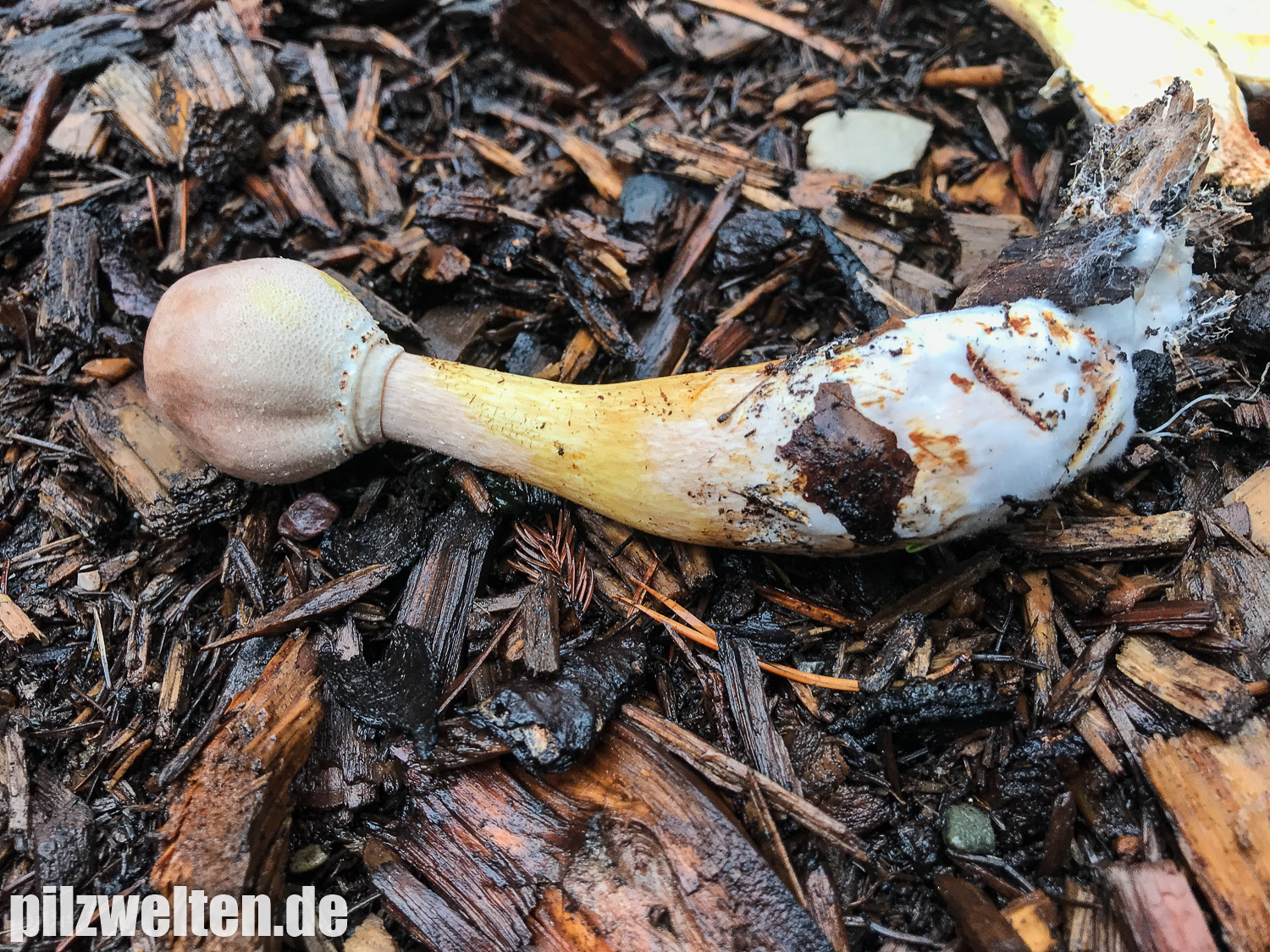 Die folgende Schirmlingsart haben wir direkt auf einem großen Rindenmulch-Haufen finden können. Mit auf diesem Haufen wuchs auch Leucoagaricus americanus in großer Stückzahl, aber die Fruchtkörper des in den Beitrag angehängten Schirmlings waren deutlich kleiner und dünnfleischiger. Der Geruch der Fruchtkörper war nicht besonders / leicht pilzig. Im Gegensatz zu Leucoagaricus americanus hatte die hier gezeigte Art auch keinen sichtbaren Stielring. Auch das Gilben der Fruchtkörper beim Schnittbild war dezenter als bei Leucoagaricus americanus. Da wir aber ansonsten keinen Ansatz haben, würden wir uns über einen Tipp freuen um welche Art es sich hier handeln könnte.