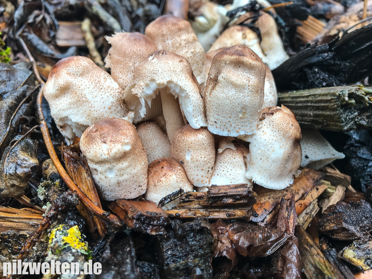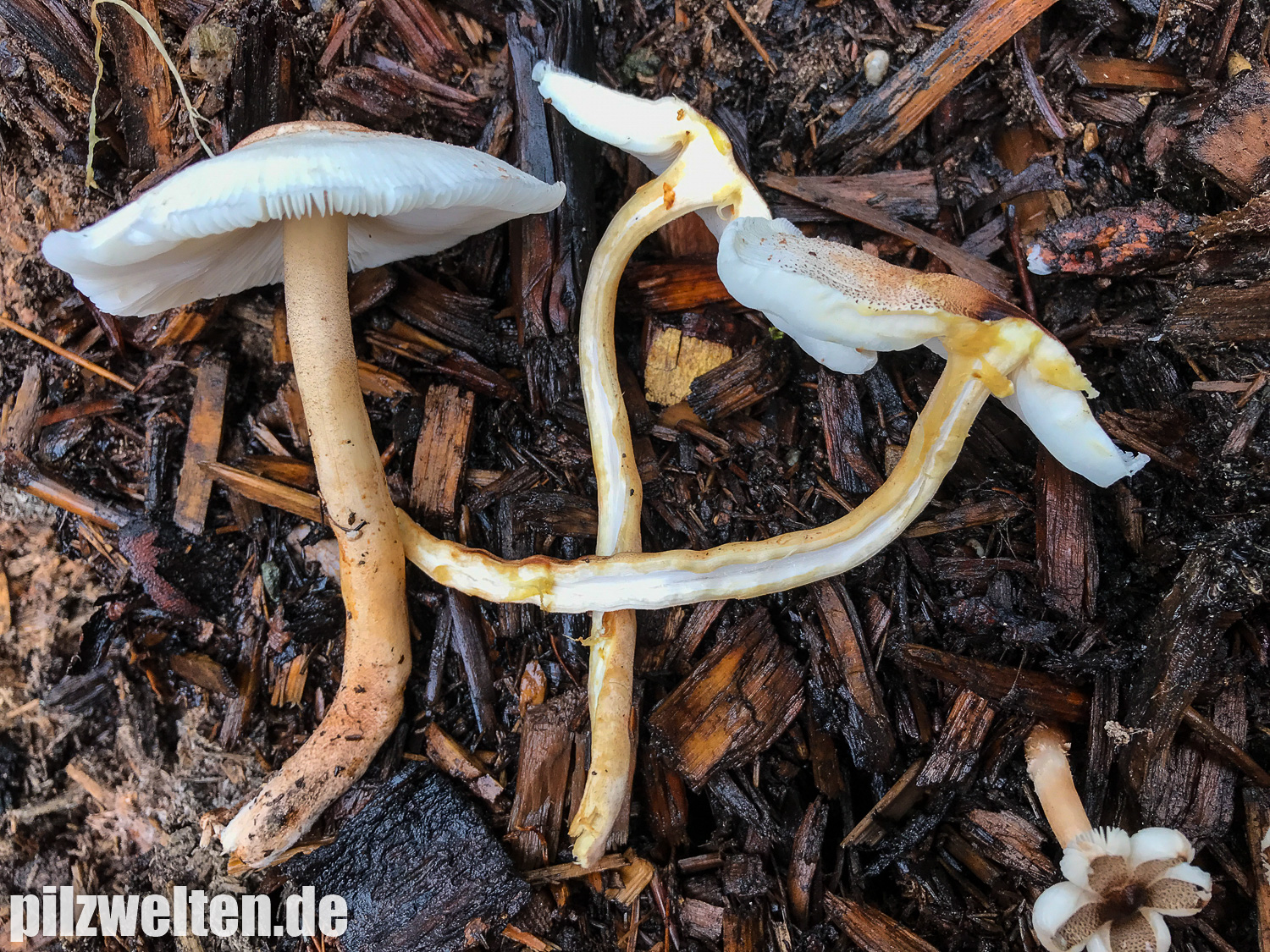 Die folgende Schirmlingsart haben wir direkt auf einem großen Rindenmulch-Haufen finden können. Mit auf diesem Haufen wuchs auch Leucoagaricus americanus in großer Stückzahl, aber die Fruchtkörper des in den Beitrag angehängten Schirmlings waren deutlich kleiner und dünnfleischiger. Der Geruch der Fruchtkörper war nicht besonders / leicht pilzig. Im Gegensatz zu Leucoagaricus americanus hatte die hier gezeigte Art auch keinen sichtbaren Stielring. Auch das Gilben der Fruchtkörper beim Schnittbild war dezenter als bei Leucoagaricus americanus. Da wir aber ansonsten keinen Ansatz haben, würden wir uns über einen Tipp freuen um welche Art es sich hier handeln könnte.