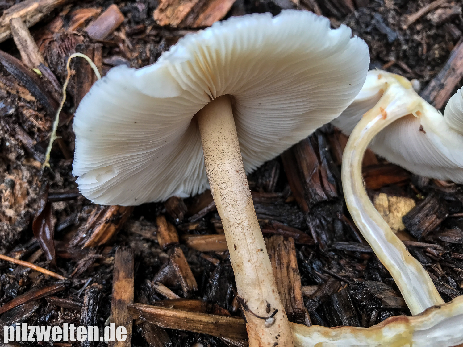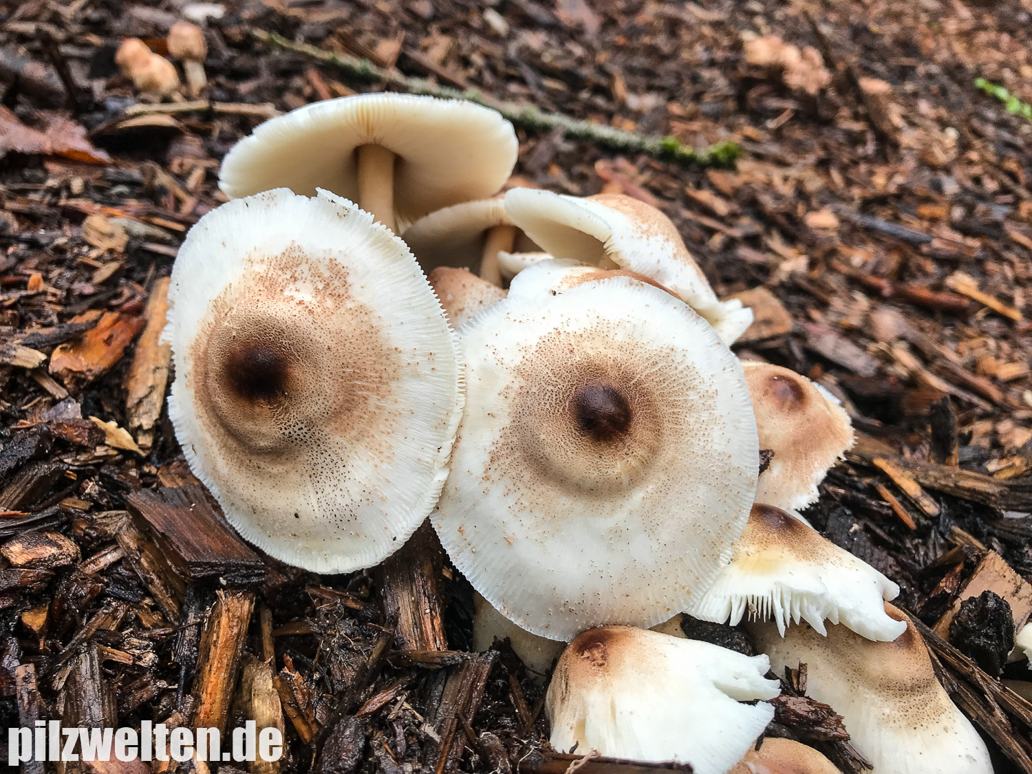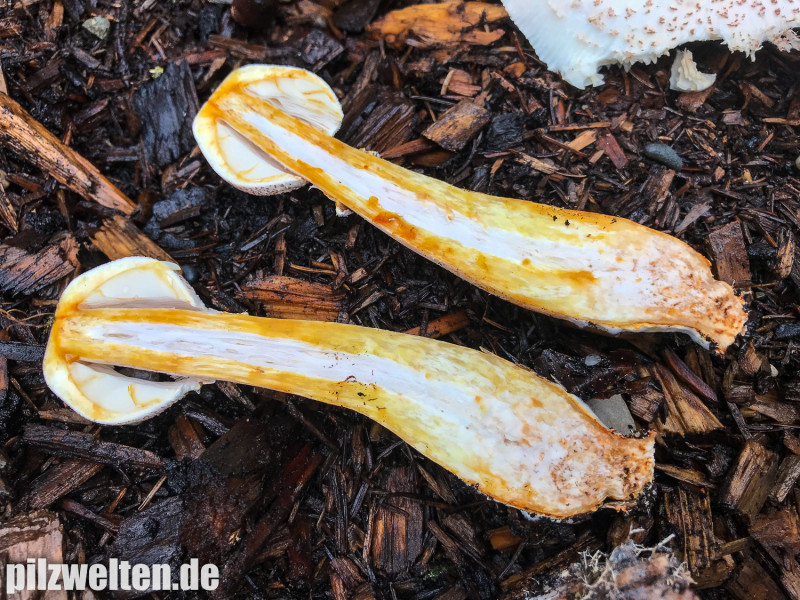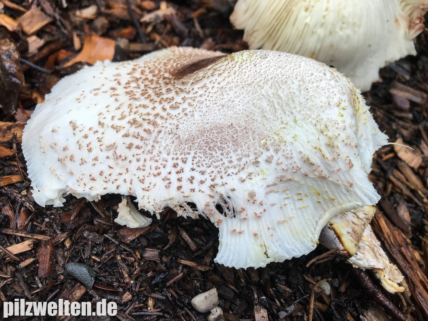 Die folgende Schirmlingsart haben wir direkt auf einem großen Rindenmulch-Haufen finden können. Mit auf diesem Haufen wuchs auch Leucoagaricus americanus in großer Stückzahl, aber die Fruchtkörper des in den Beitrag angehängten Schirmlings waren deutlich kleiner und dünnfleischiger. Der Geruch der Fruchtkörper war nicht besonders / leicht pilzig. Im Gegensatz zu Leucoagaricus americanus hatte die hier gezeigte Art auch keinen sichtbaren Stielring. Auch das Gilben der Fruchtkörper beim Schnittbild war dezenter als bei Leucoagaricus americanus. Da wir aber ansonsten keinen Ansatz haben, würden wir uns über einen Tipp freuen um welche Art es sich hier handeln könnte.