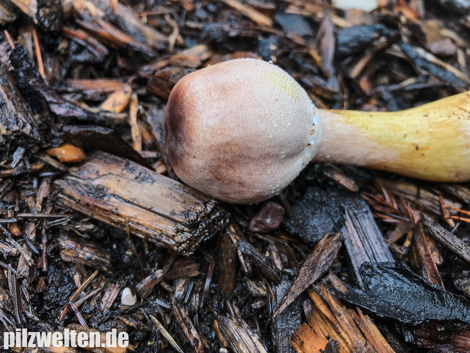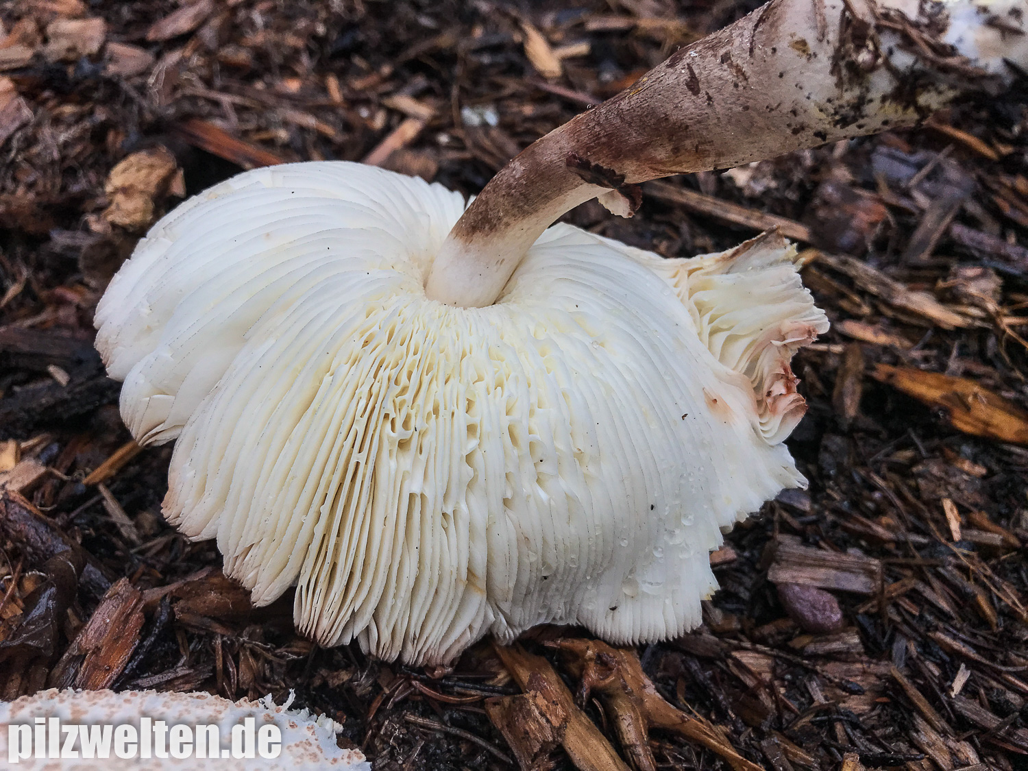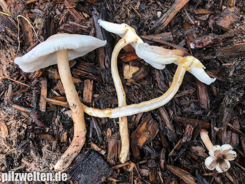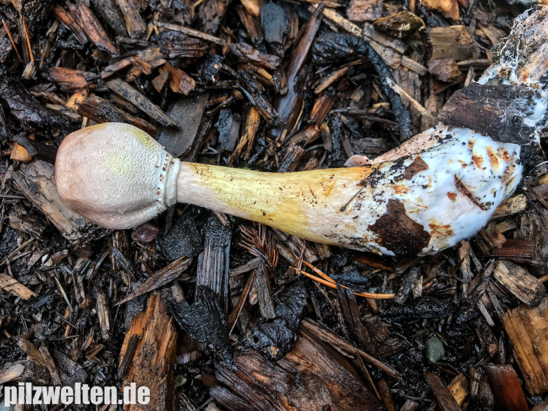 Die folgende Schirmlingsart haben wir direkt auf einem großen Rindenmulch-Haufen finden können. Mit auf diesem Haufen wuchs auch Leucoagaricus americanus in großer Stückzahl, aber die Fruchtkörper des in den Beitrag angehängten Schirmlings waren deutlich kleiner und dünnfleischiger. Der Geruch der Fruchtkörper war nicht besonders / leicht pilzig. Im Gegensatz zu Leucoagaricus americanus hatte die hier gezeigte Art auch keinen sichtbaren Stielring. Auch das Gilben der Fruchtkörper beim Schnittbild war dezenter als bei Leucoagaricus americanus. Da wir aber ansonsten keinen Ansatz haben, würden wir uns über einen Tipp freuen um welche Art es sich hier handeln könnte.