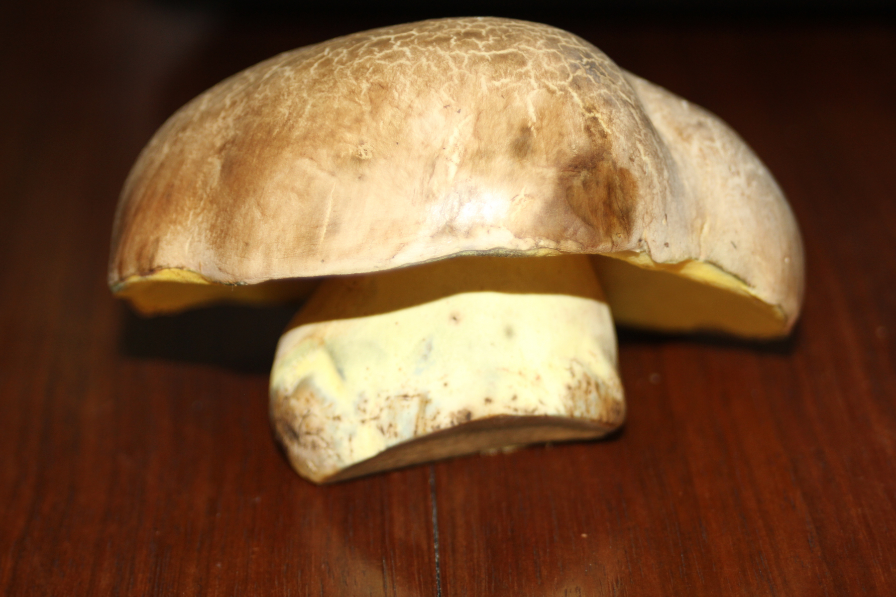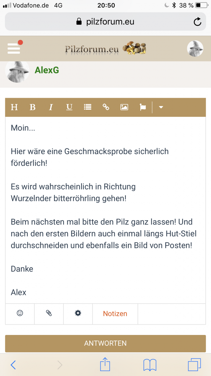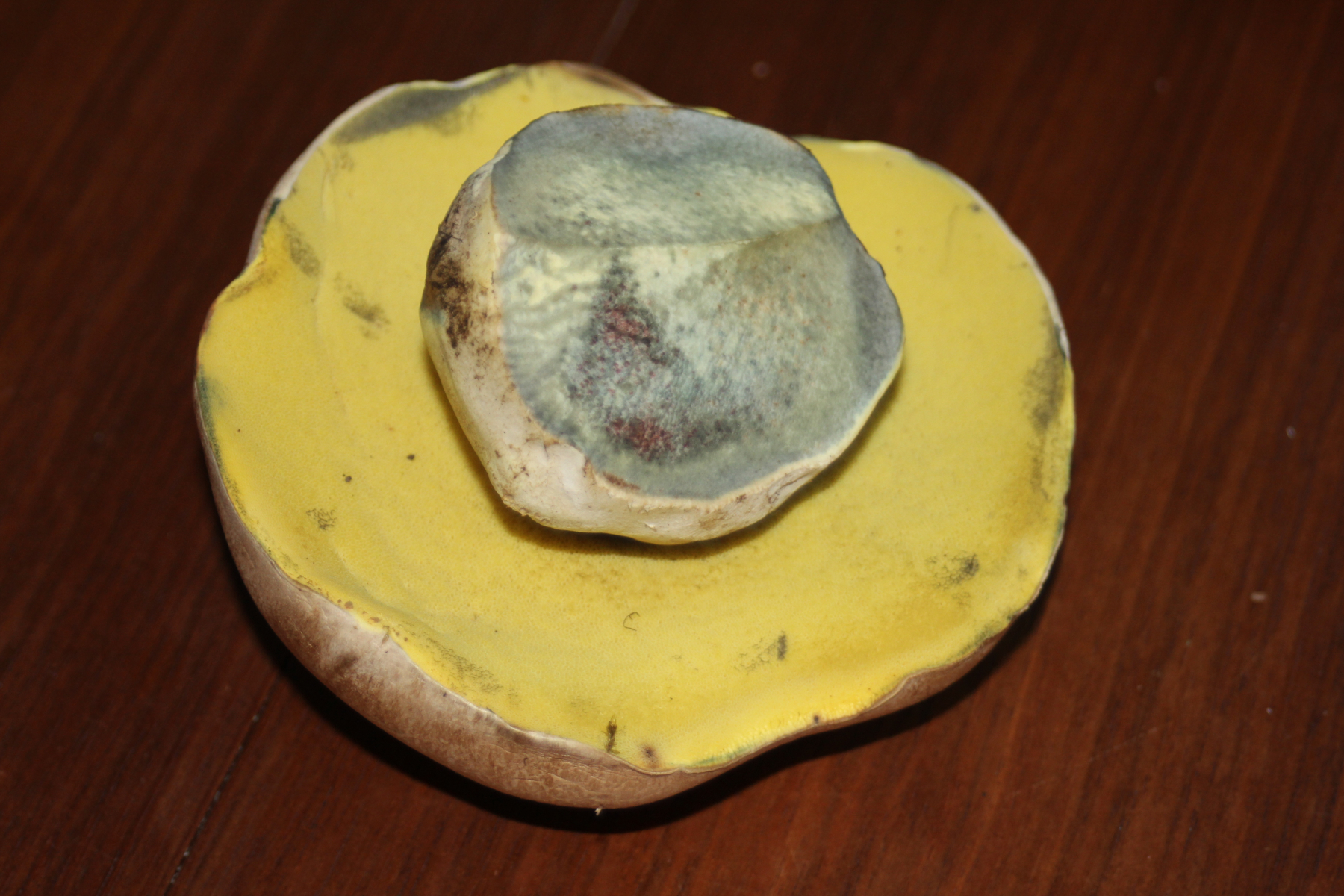 Heute habe ich diesen schönen Röhrling im Hof gefunden. Auffalend war die leichte Verfärbung des angeschnittenen Stiels zu grün-blau. Der Stiel ist eindeutig ohne Netz. Angenehmer Geruch mit einer Note, die ich irgendwie nich begreifen kann. Mir fällt nichts ein, was das für ein Pilz ist. Könnte mir bitte jemand helfen? Danke in voraus!