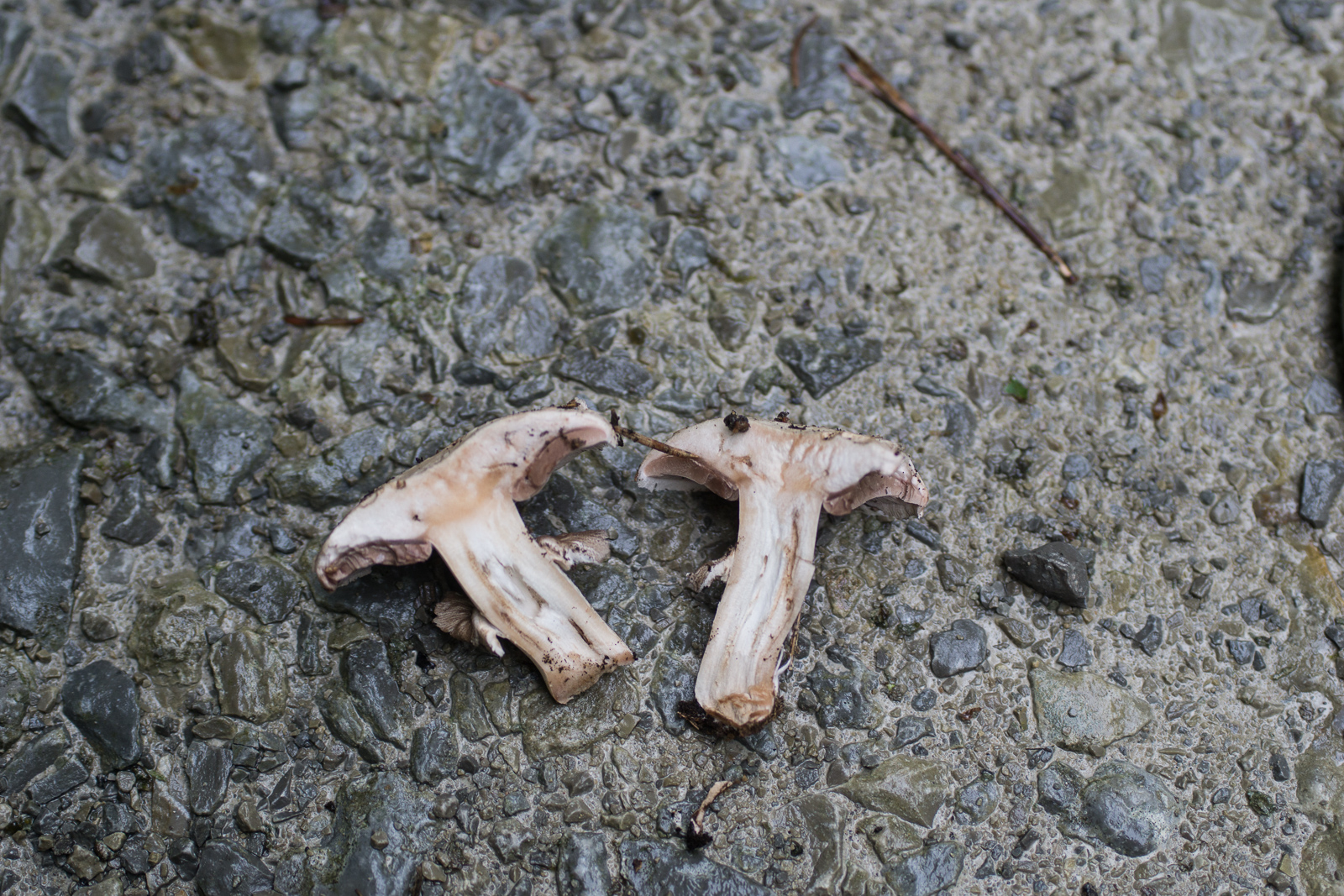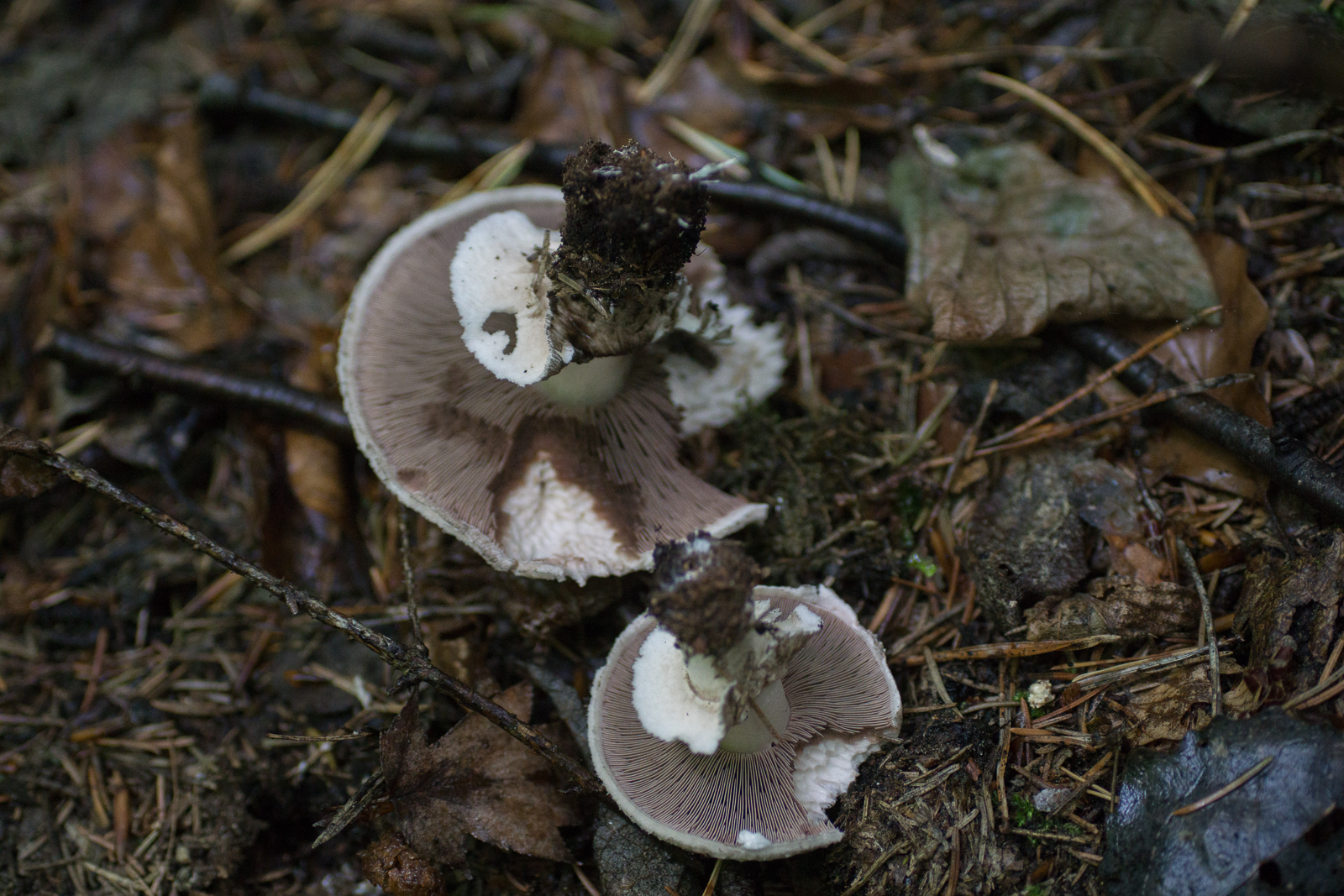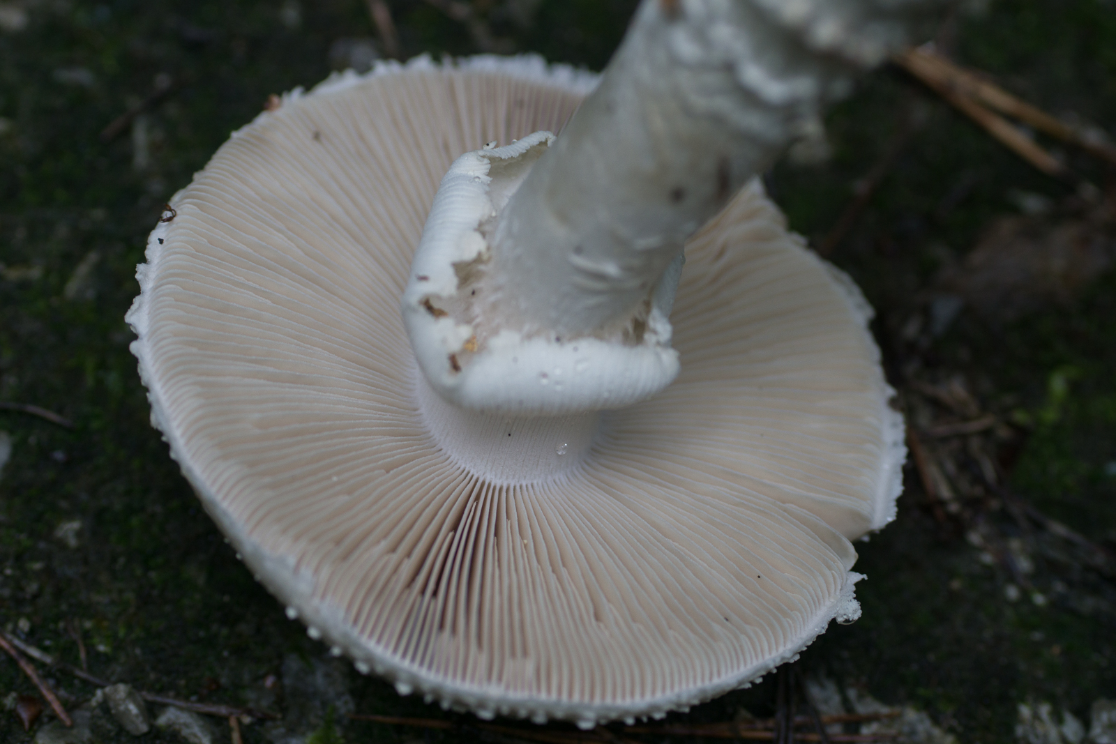 puh, auch so schwierig... die nachgereichten Bilder erinnern mich ehrlich gesagt an Agaricus bisporus var. eutetrasporus. Der kann auch recht schmächtig ausfallen und der Ruing ist dünner als in der var. bisporus. Die Art des Rötens, das in Bräunliche geht, die Rhizomorphen, das würde passen. Ob am Stiel noch Velumreste waren, kann ich an den Exemplaren nicht erkennen.