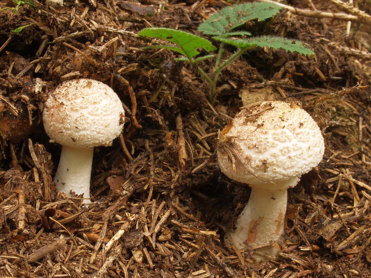 Einige recht kleine, blasse Perlpilze (Amanita rubescens) drückten sich aus einer Böschung heraus.