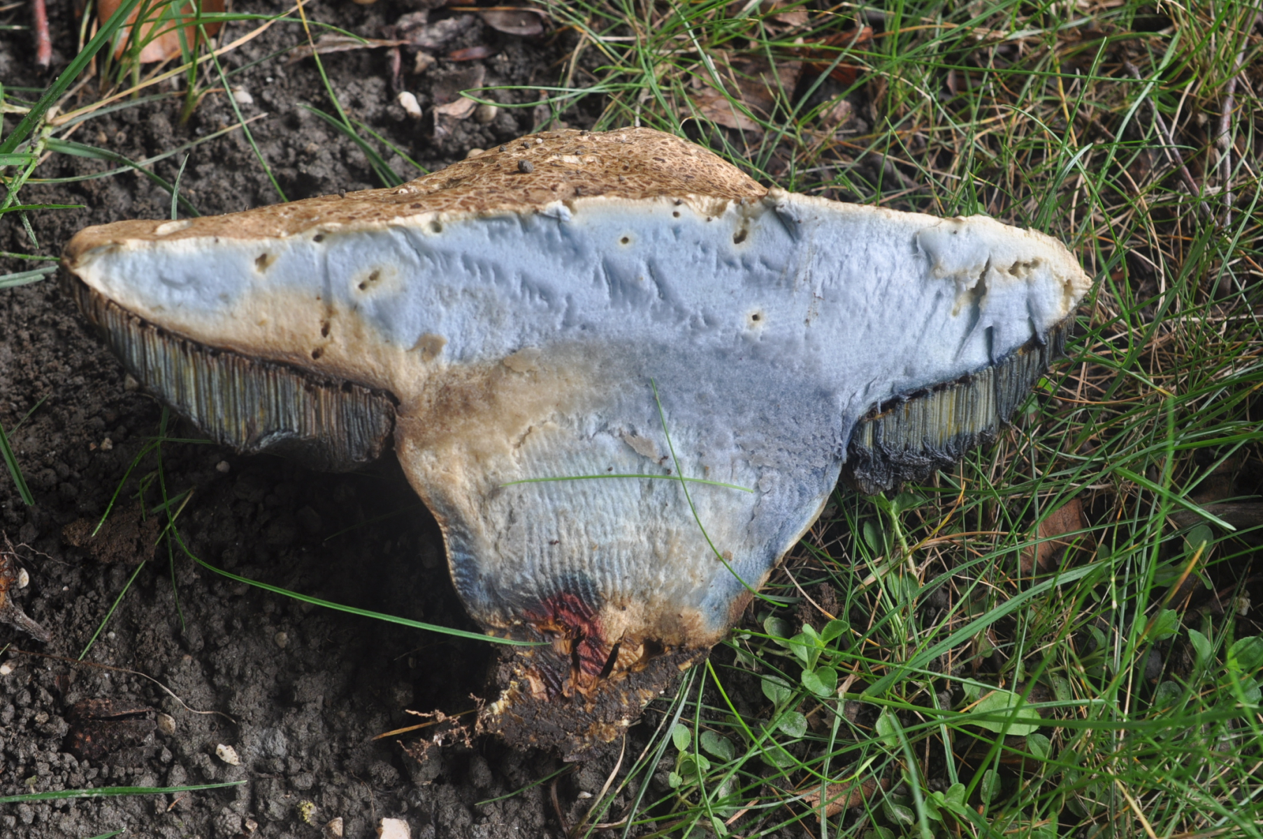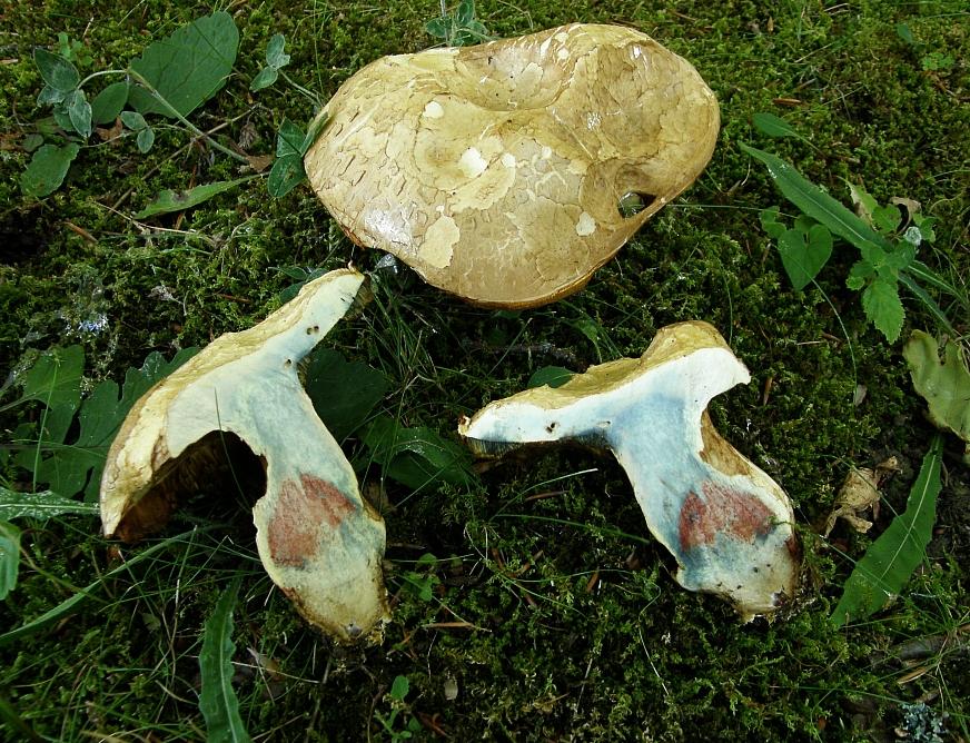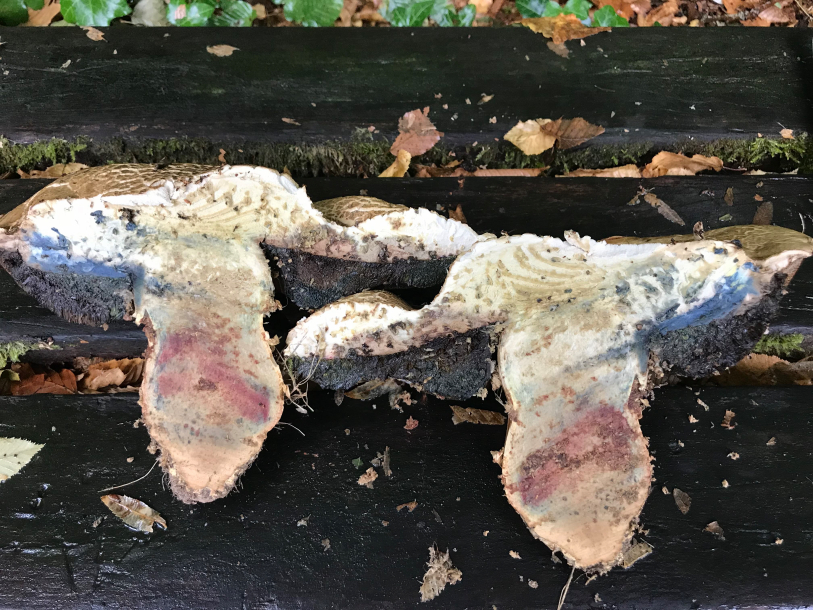 Das Stielfleisch rötet während die Poren auf Druck blau einfärben.