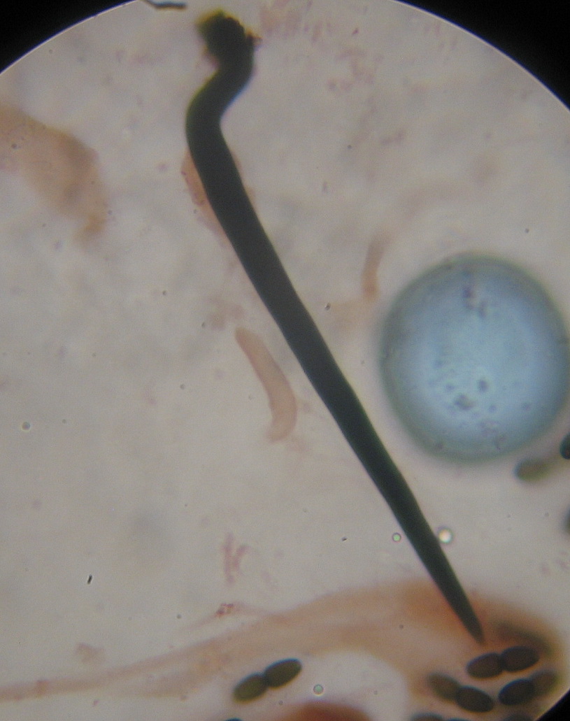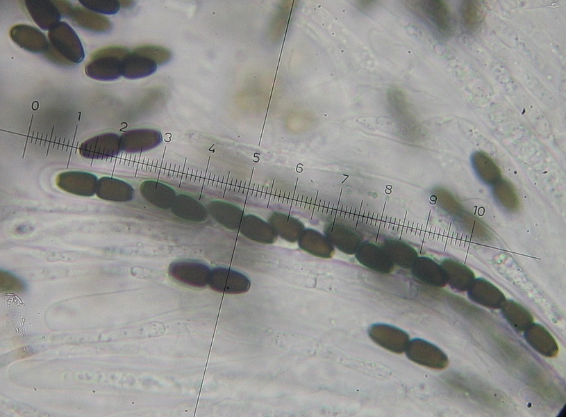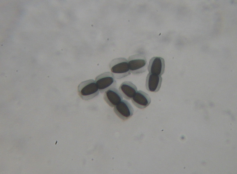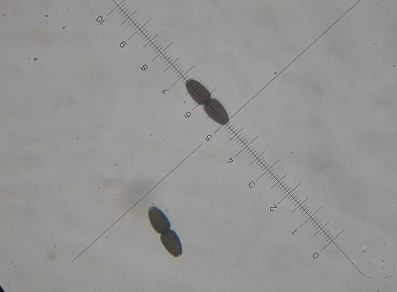 braune, 1-fach septierte Sporen (2-geteilte Sporen bei Reife in Teilsporen aufgeteilt) an jedem Ende mit großem Keimporus, 16-18 x 4,5-5µ mit einer in der Mitte taillierten Schleimhülle, lassen mich auf