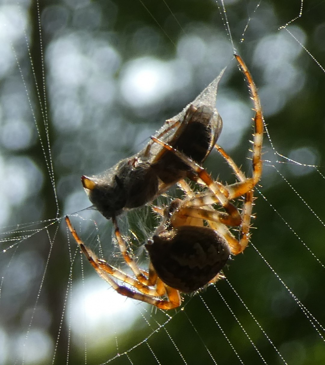 Ebenfalls am 05.09. fotografierte ich eine Gartenkreuzspinne. Noch während ich sie fotografierte flog ein Opfer in ihr großes Netz und weg war sie, so schnell konnte ich gar nicht schauen. Rasend schnell griff sie sich ihre Beute und fing sofort an diese einzuwickeln. Einfach nur faszinierend.
