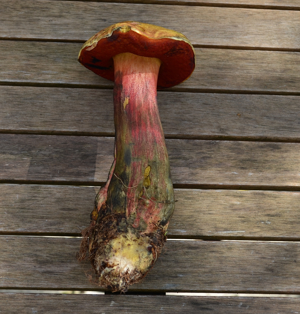 ich beschäftige mich erst seit ein paar Wochen intensiver mit Pilzen, obwohl ich einen artenreichen Pilzwald fast vor meiner Haustür auf der Münchner Schotterebene habe. Heute habe ich bei einen Streifzug einen recht eindeutigen Hexenröhrling gefunden, bin mir aber als blutiger Anfänger nicht sicher, um welche Art es sich genau handelt. Es handelt sich um einen Mischwald, im Wesentlichen Fichten, Kiefern, Eichen und einige Hainbuchen. Fundort war an einer lichten Stelle mit vielen Jungbäumen. Der hat eine stattliche Höhe von gut 20 cm, was wohl der sehr hohen Moosschicht geschuldet ist, die an dieser Stelle wächst. Man kann das gut auf dem Fundfoto sehe.