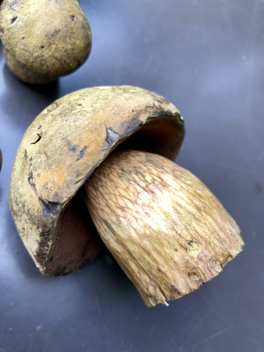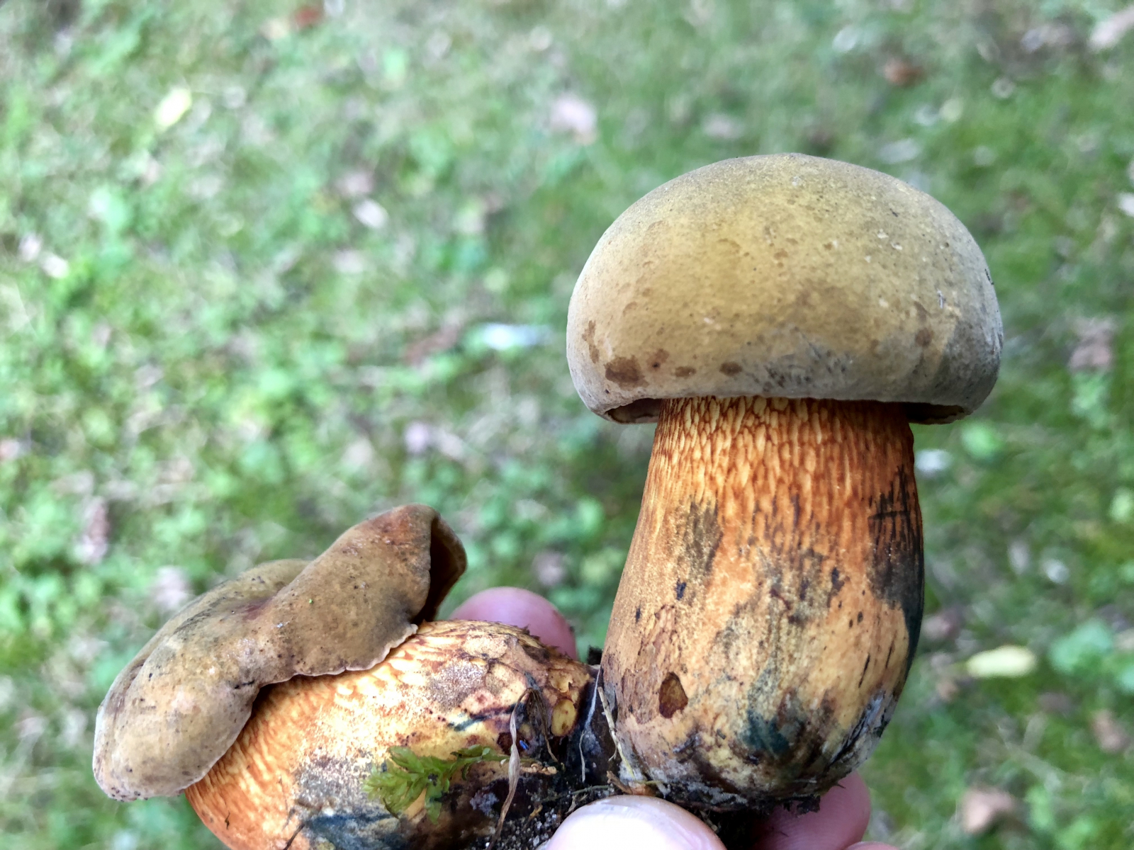 Hallo zusammen, diese Pilze habe ich heute gefunden, unter Buchen in einem Park. Zwei davon haben sehr helle Hüte. Ich hab sie später aufgeschnitten, sie blauen sehr stark. Es gibt auch einen roten Streifen zwischen Hutfleisch und Lamellen. Boletus Satanas ist aber nicht dabei, oder?