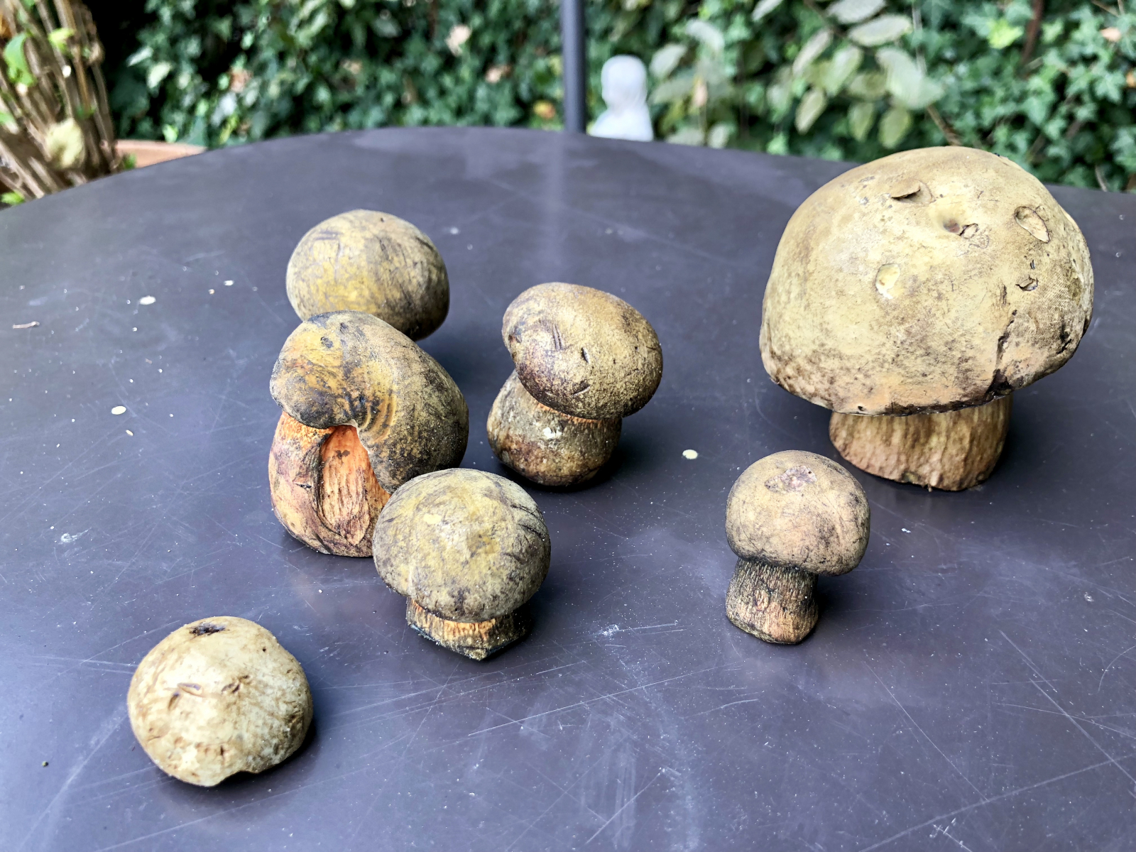 Hallo zusammen, diese Pilze habe ich heute gefunden, unter Buchen in einem Park. Zwei davon haben sehr helle Hüte. Ich hab sie später aufgeschnitten, sie blauen sehr stark. Es gibt auch einen roten Streifen zwischen Hutfleisch und Lamellen. Boletus Satanas ist aber nicht dabei, oder?