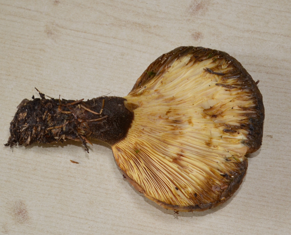 Dann habe ich noch einige bräunlich-gelbe Seitlinge entdeckt, die an liegenden Fichtenstämmen wuchsen. Hier komme ich mangels Literatur leider auch nicht weiter: