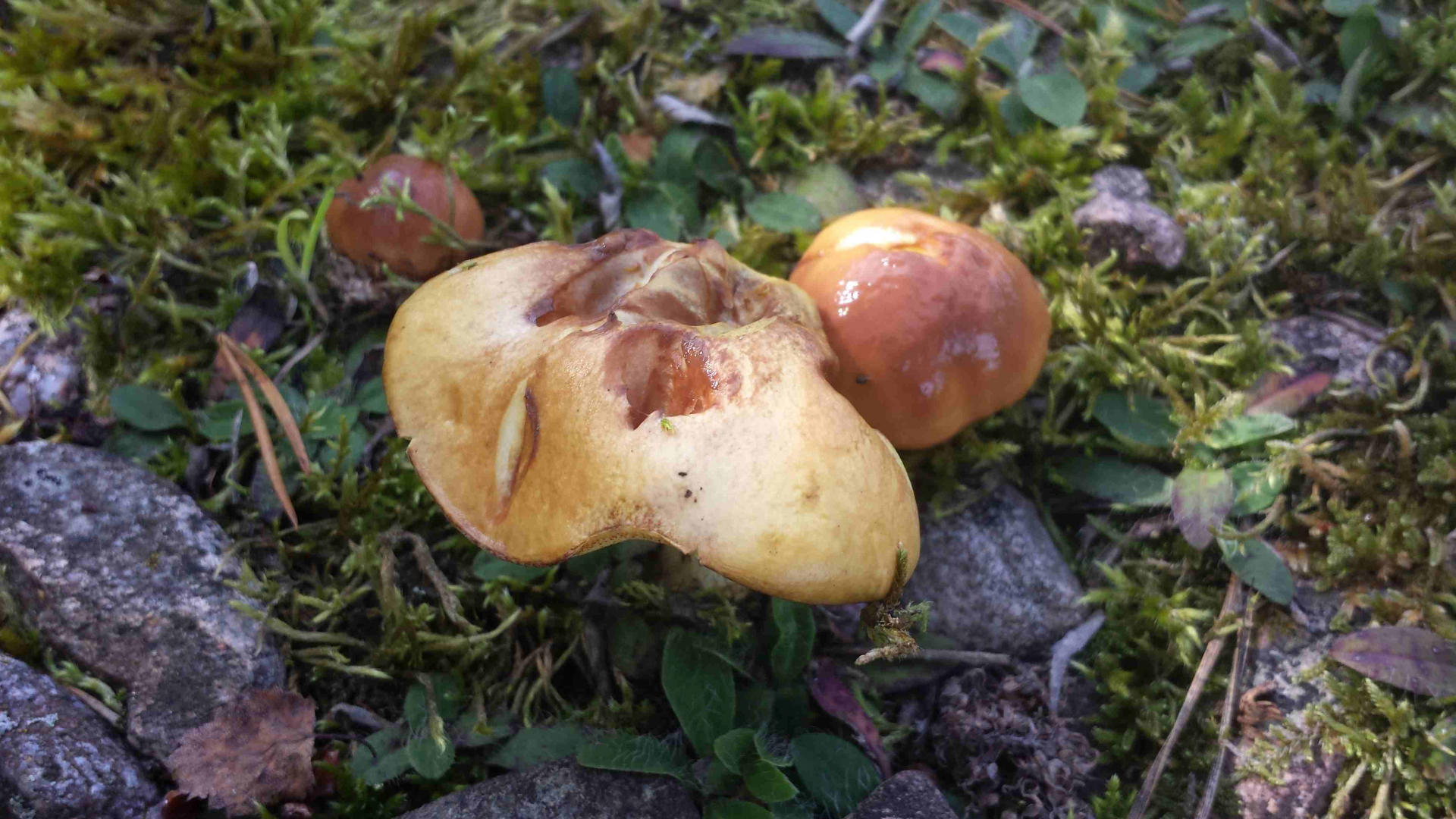 Außer den >Körnchenröhrlingen< sind da aber auch noch Fragmente eines anderen Pilzes, der keiner der Schmierröhrlinge ist.Zu was diese Hutbruchstücke auf de zweiten und dritten Bild aber gehören könnten, ist ziemlich unmöglich zu sagen.