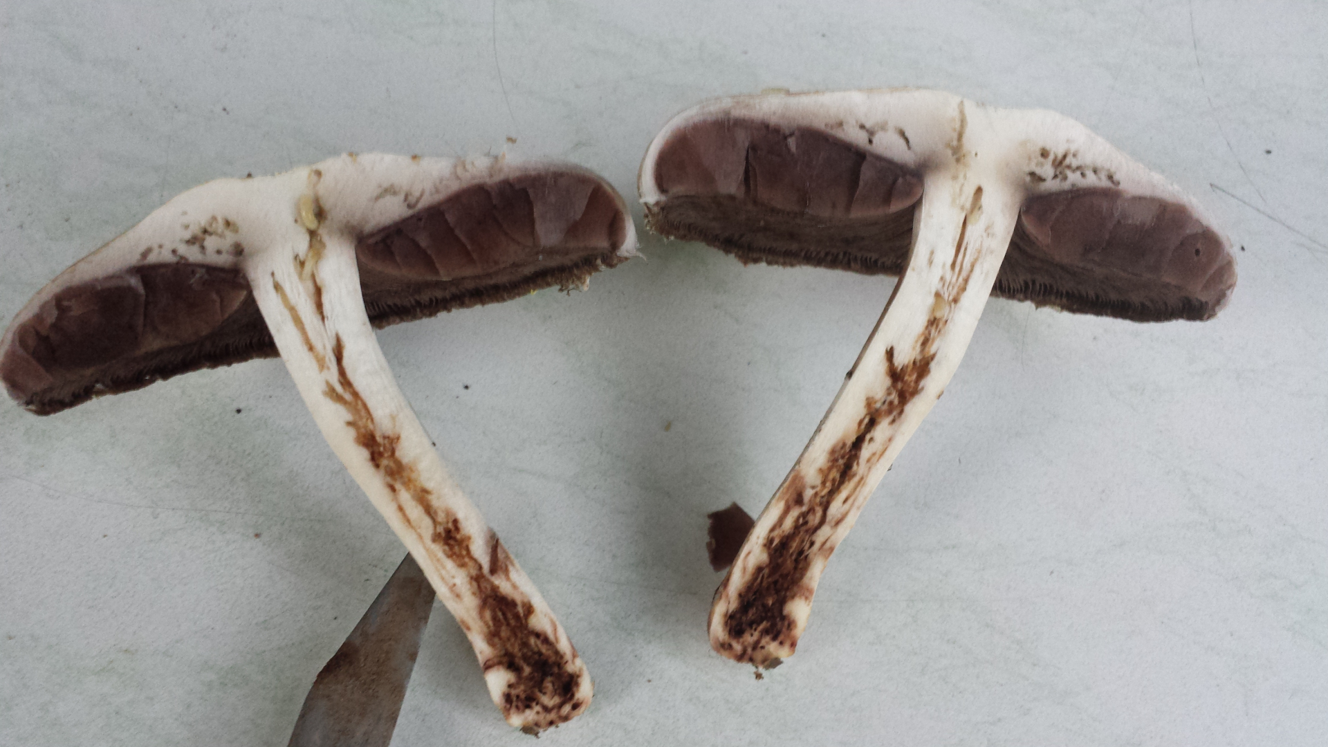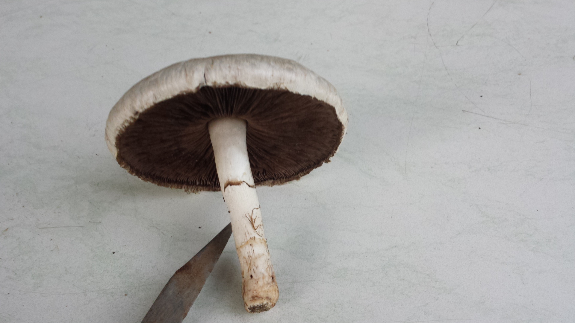 Von der Ringstruktur her kann das schon eher eine Art aus der Gruppe um den Wiesenchampi (Agaricus campestris) sein. Wobei man im Kopf haben sollte, daß da auch kritsiche (als Speisepilz eher ungeeignete) Arten dabei sind wie zB Agaricus moellerianus, Agaricus pseudopratensis usw.Stielbasis scheint hier auch ein liechtes Knällchen zu haben, die Form passt da eigentlich nicht wirklich zu Agaricus campestris im eigentlichen Sinne.