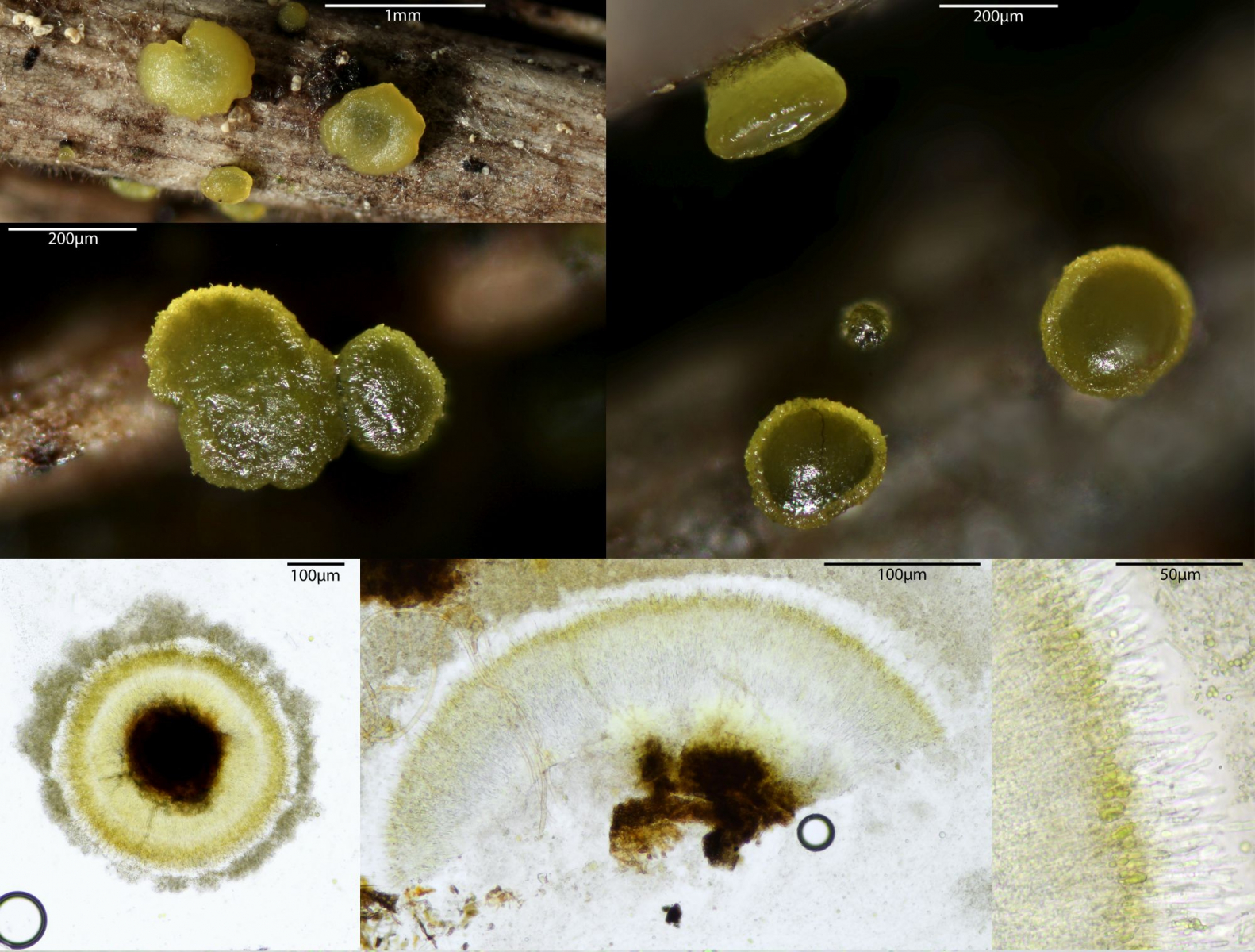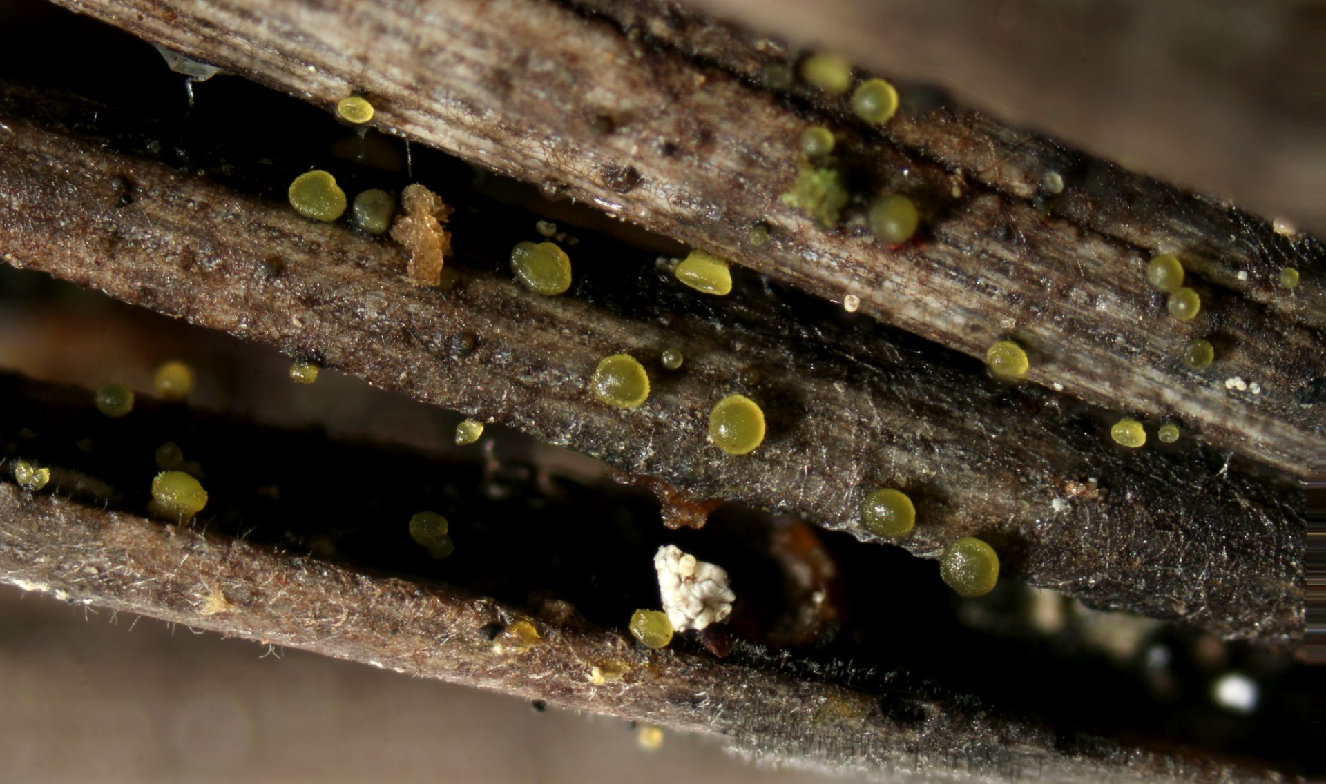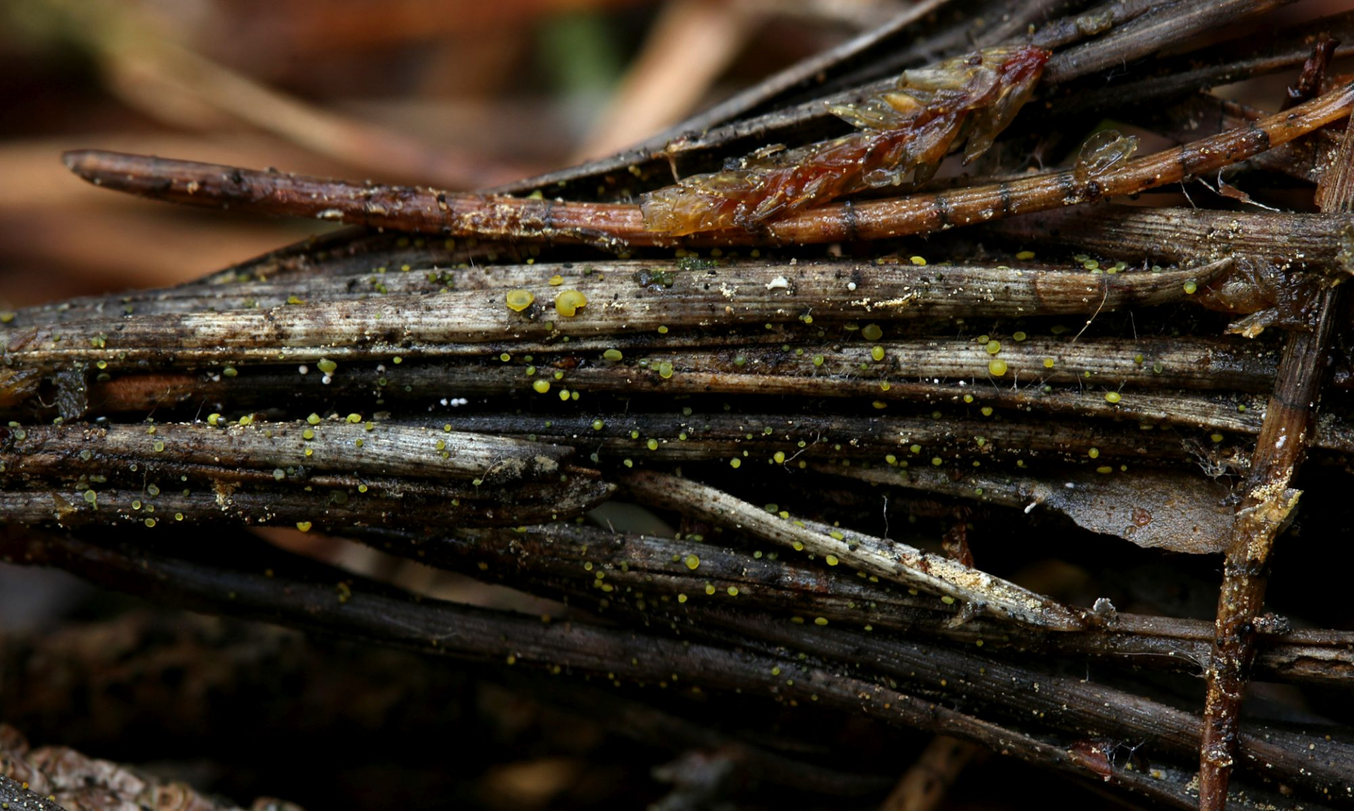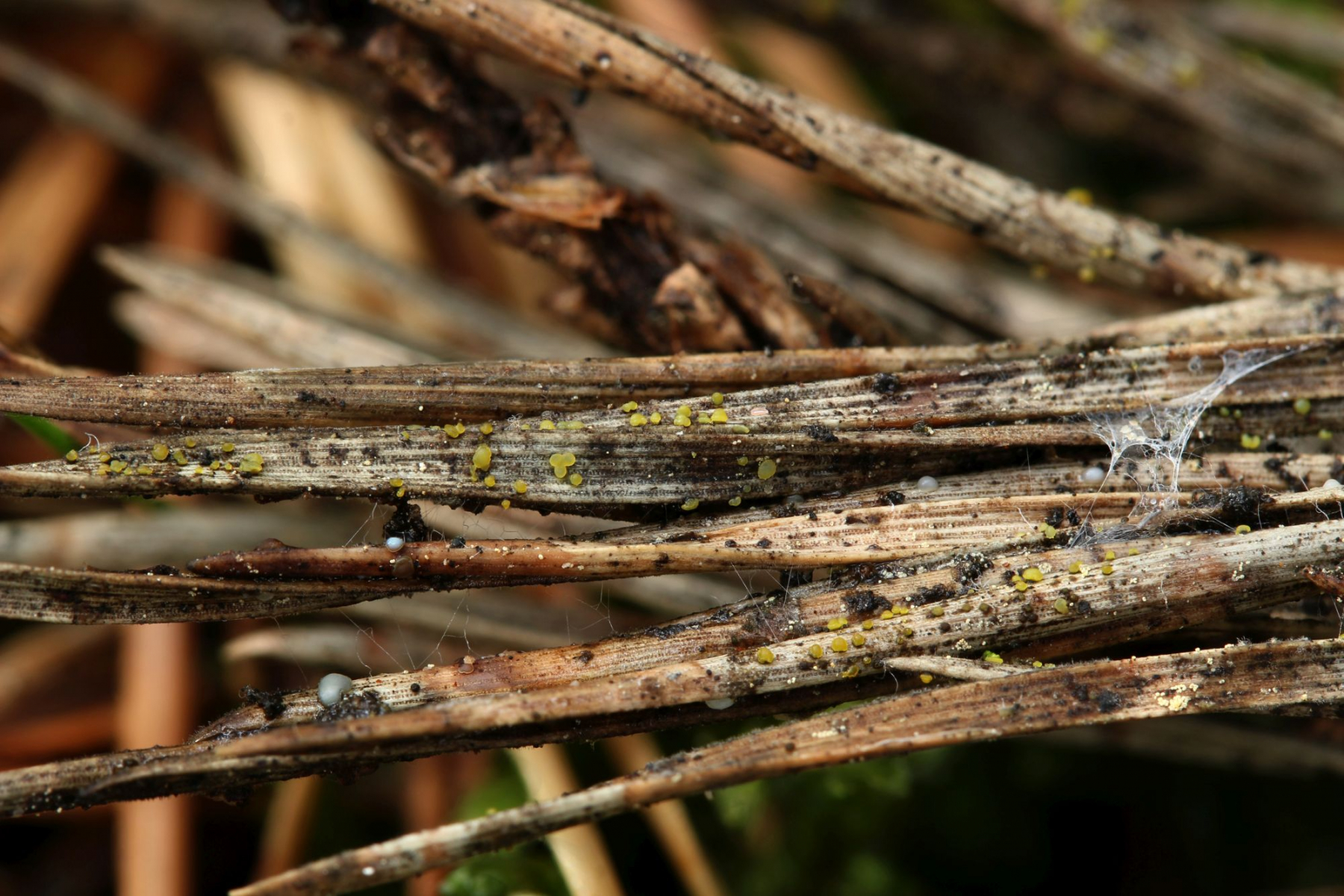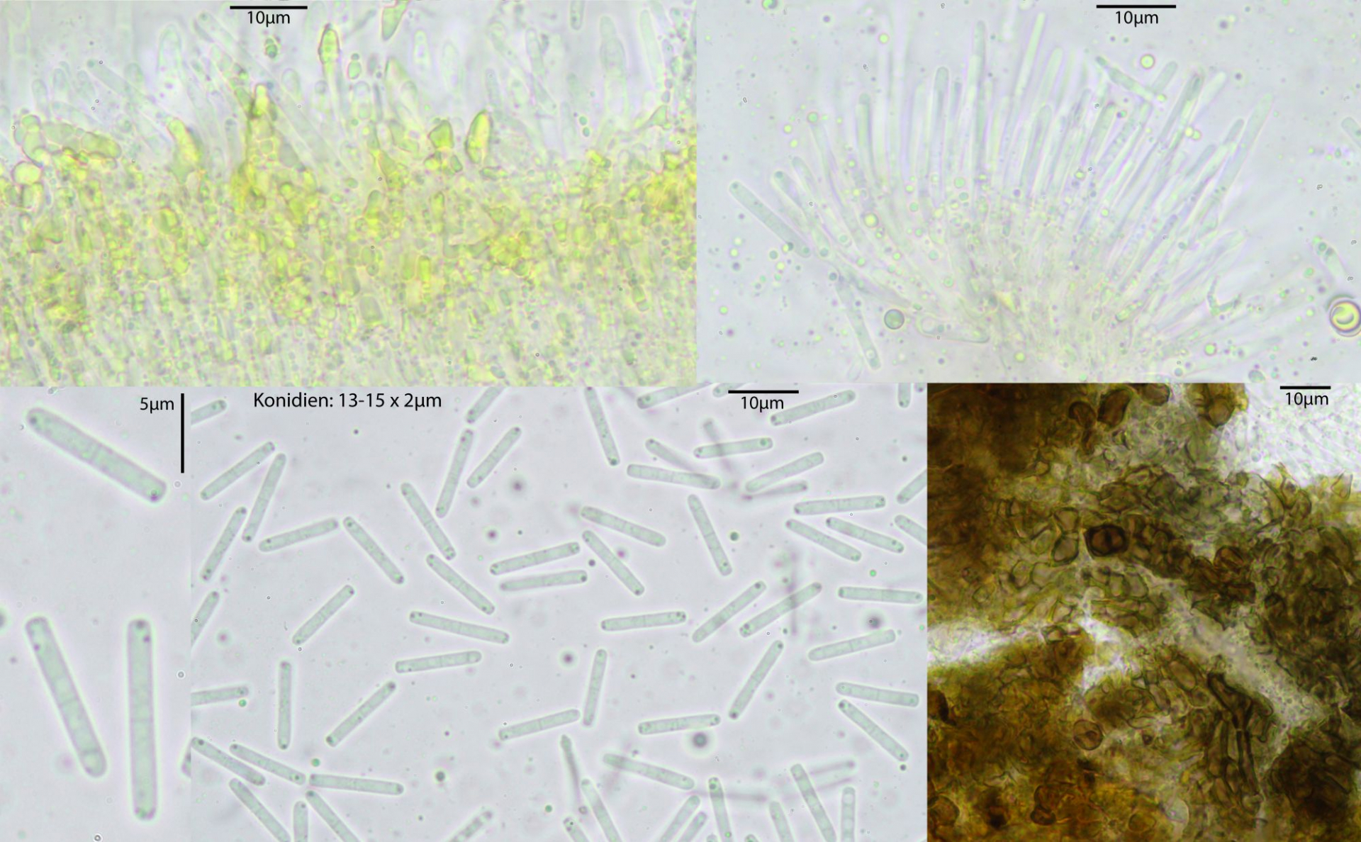 wie schon öfters konnte ich es kürzlich natürlich nicht lassen, einige Kiefernnadel-Büschel umzudrehen. Dabei fand ich - nicht zum ersten Mal - eine auffällig gelb gefärbte Anamorphe, die makroskopisch an das erinnert, was man Dendrodochium citrinum nennt. Mikroskopisch aber ist das was ganz anderes, hat große, stäbchenförmige, 1-fach septierte Sporen.