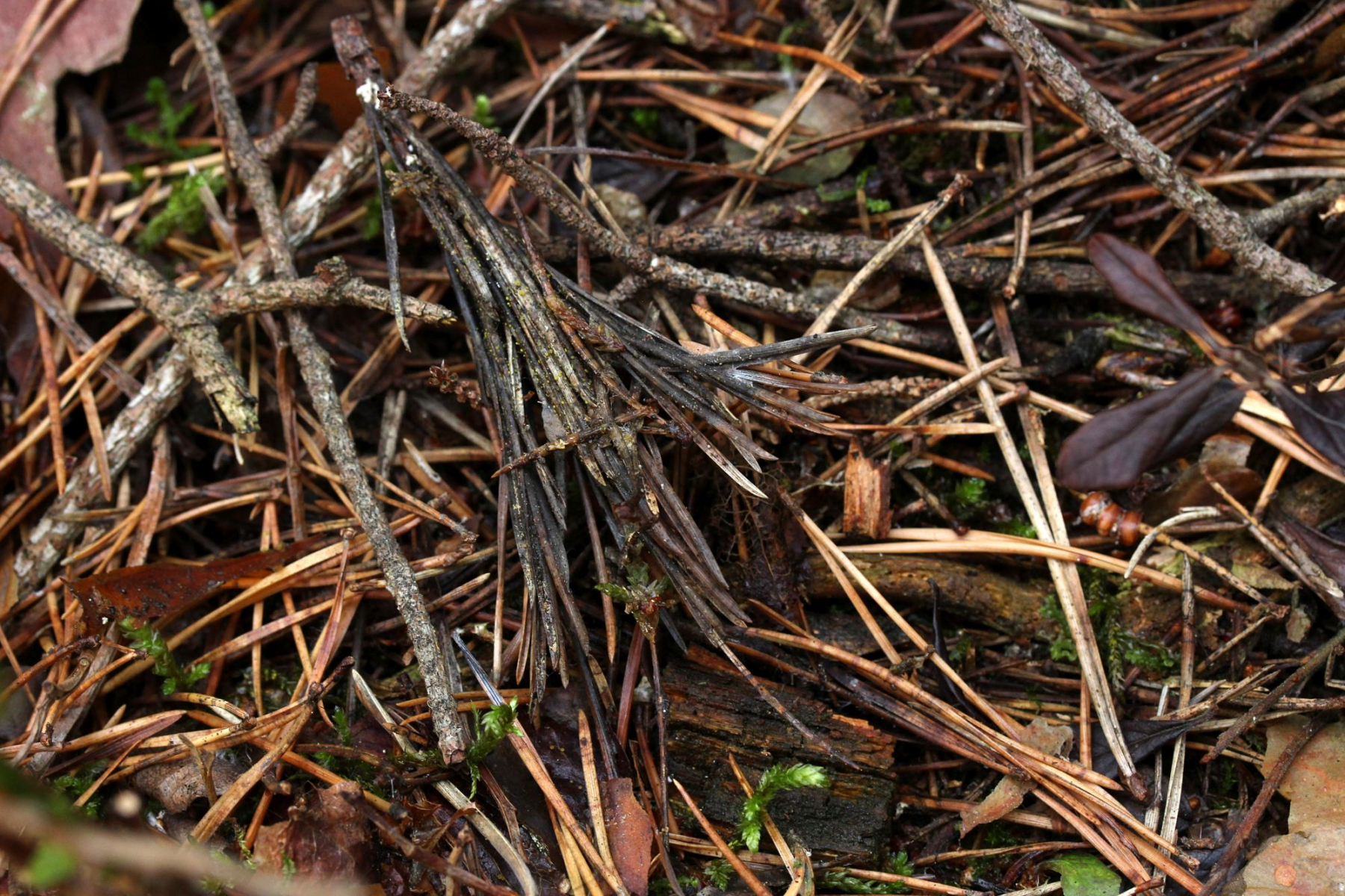 Vor Ort sieht man erst mal ziemlich alte, dunkle Kiefernnadeln. Der Büschel ist schon umgedreht, wenn man genau hinsieht, sind die gelben Pünktchen schon zu sehen: