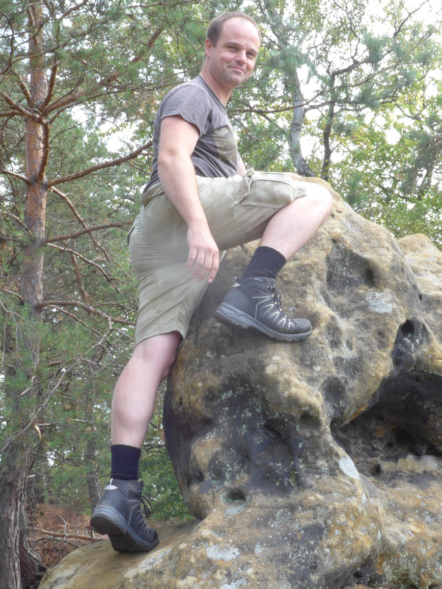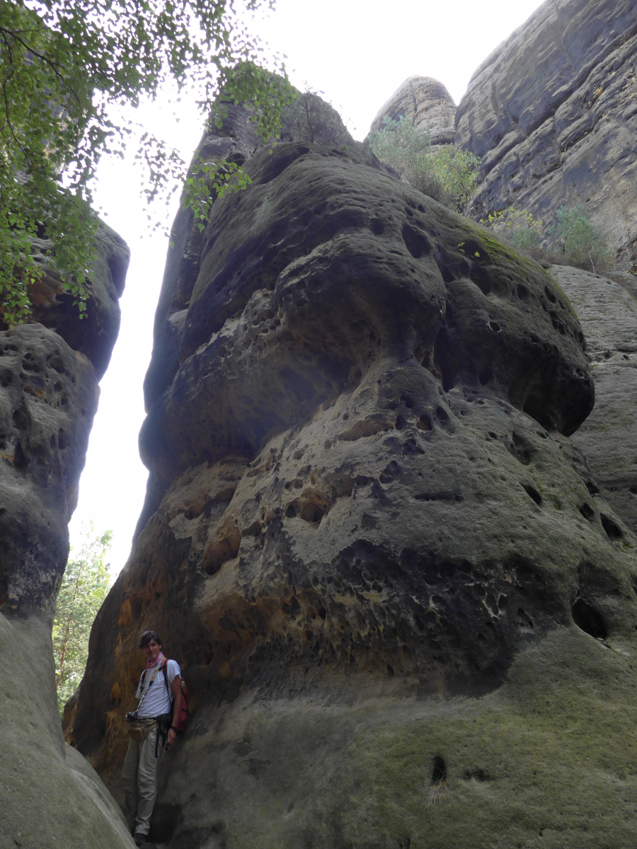 Eine kleine Klettereinlage gabs "gratis". Ich hab mich sehr darüber aufgeregt, denn von 2-3 h vorher hat´s noch tierisch geregnet. Klettern bei Nässe ist verboten. Nasser Sandstein ist sehr bröcklig und ist nicht so stabil wie trockener. Zudem steigt auch die Sturzgefahr wenn Griffe oder Tritte plötzlich rausbrechen...