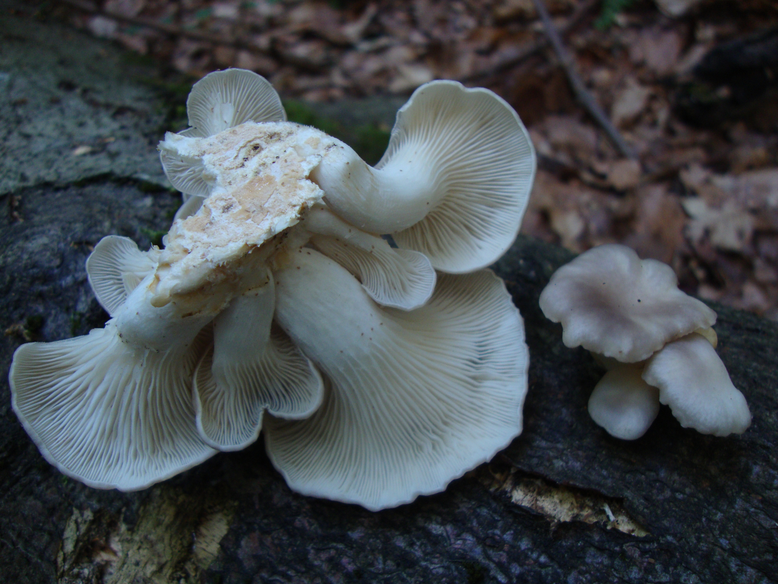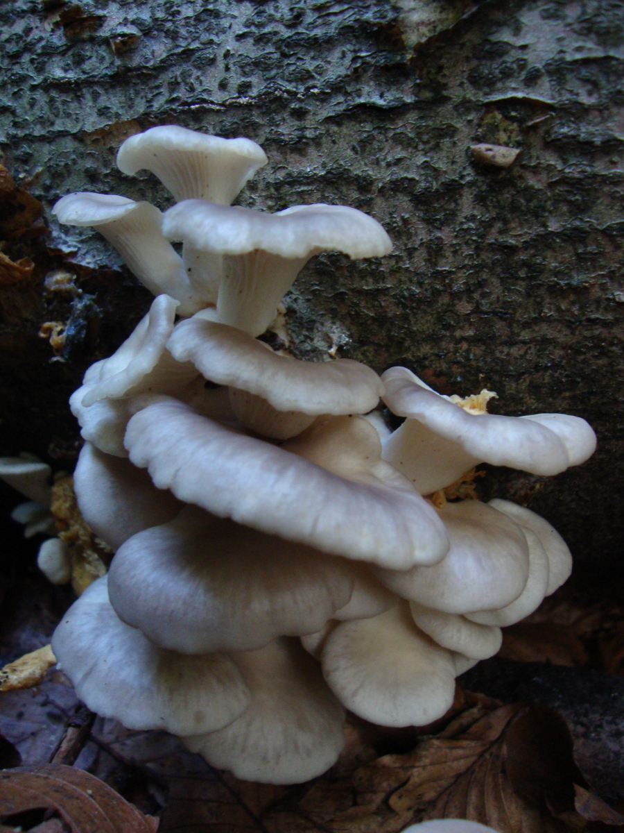 Meine Frage ist nun: Ist es möglich, dass die ganzen überständigen Seitlinge P. pulmonarius waren, die ja im Sommer erscheinen, und dass die jungen frischen grauen Seitlinge, die ich mitgenommen habe, ganz einfach schon die ersten P. ostreatus der Saison sind, die ja nur sehr selten schon im September erscheinen? Dann müssten aber beide Arten gemeinsam auf dem gleichen Stamm wachsen (und das in mind. zwei Fällen).