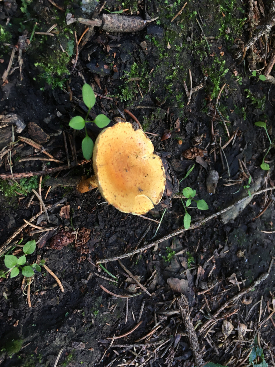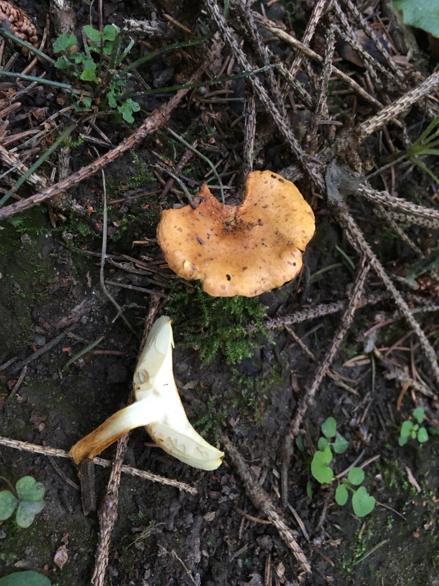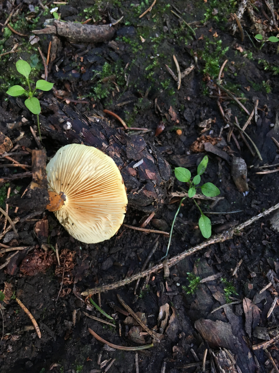 Mit der Hut- und Lamellenfarbe könnte man hier auch vage an >Hygrophoropsis rufa< denken.