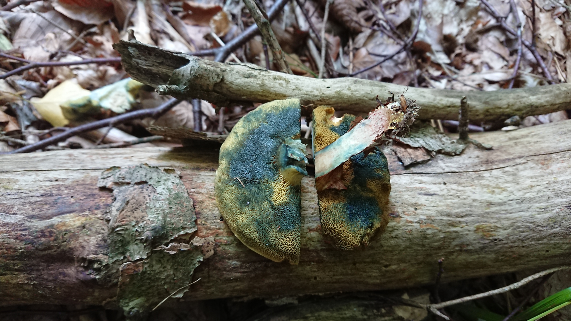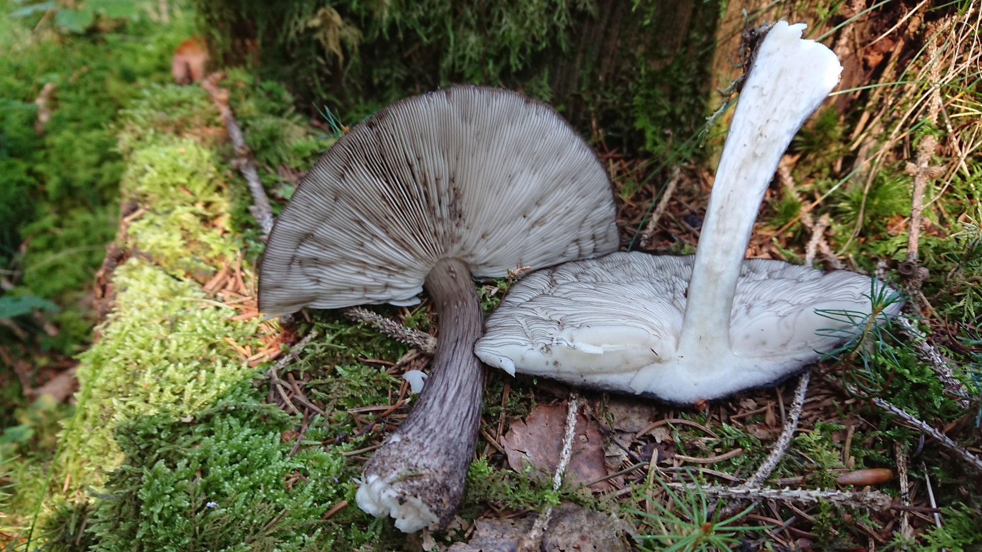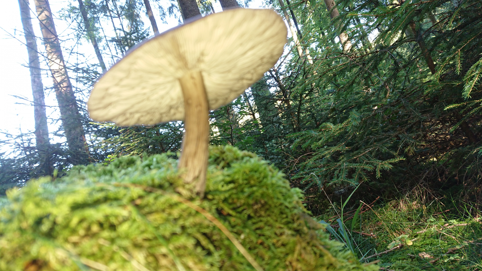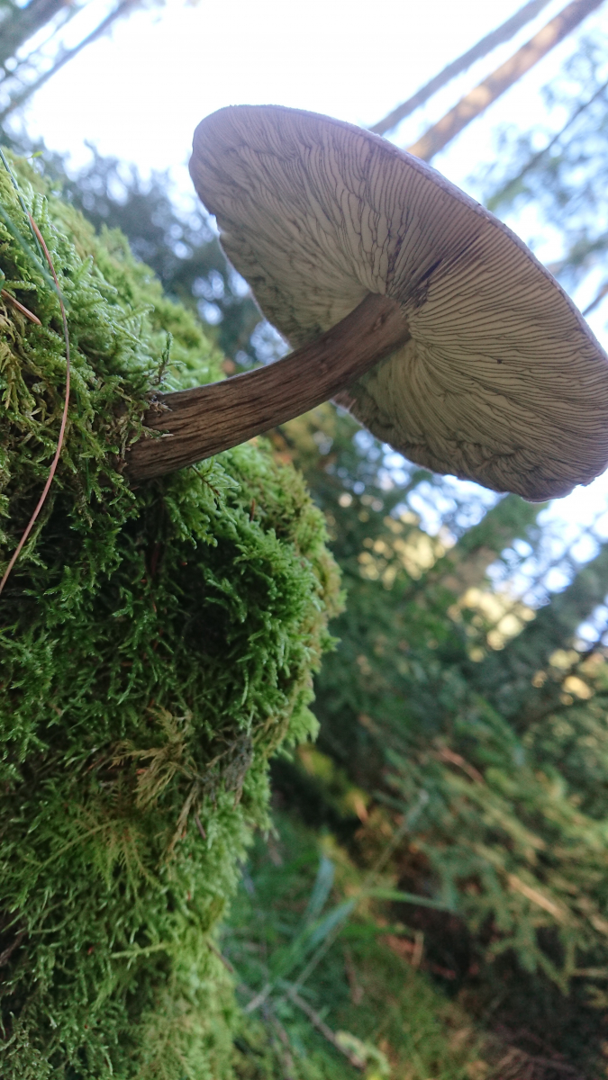 Hut ca. 12 cm Durchmesser, Höhe etwa 10 cm. Wächst auf einem bemoosten Baumstumpf. Kein nennenswerter Geruch.