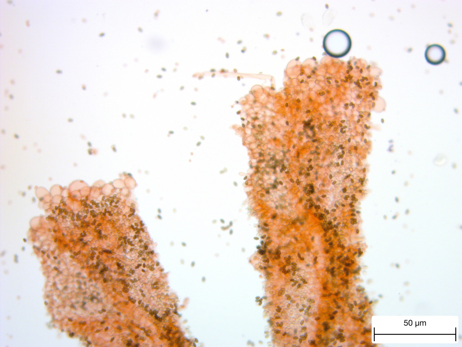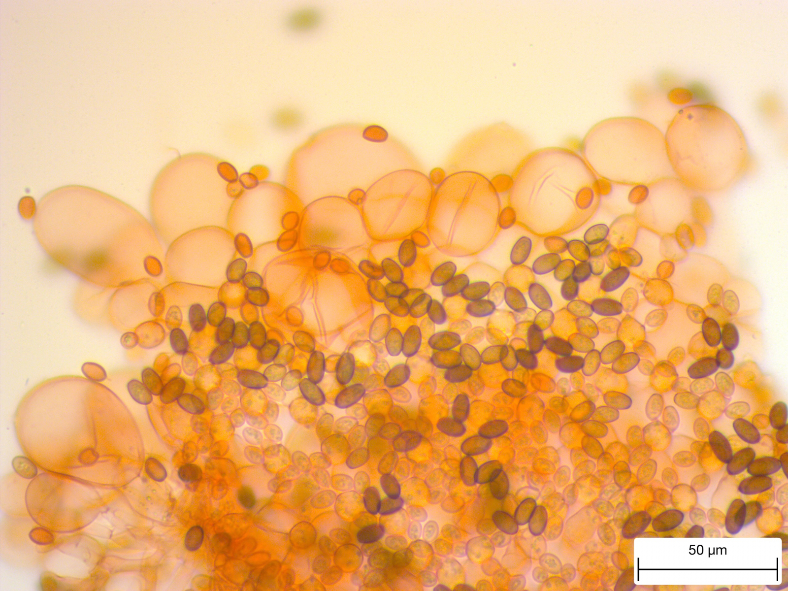 In der Tat, auf dem Sporenbild sehen die Sporen reichlich hell aus, für einen Mistpilz. Bolbitius müsste doch bräunliche Sporenwände haben? Wass man gerade in solcher Masse gut sehen müsste.