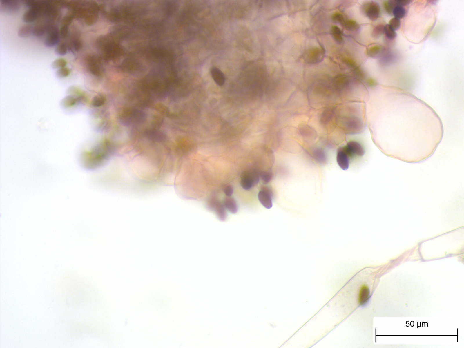 Sporen und Cheilozystiden vierhundertfach vergrößert aus dem pigmentarmen Fruchtkörper. Gut erkennbar ist, dass die Sporen heller sind als im zweiten Mikrobild mit derselben Vergrößerung.